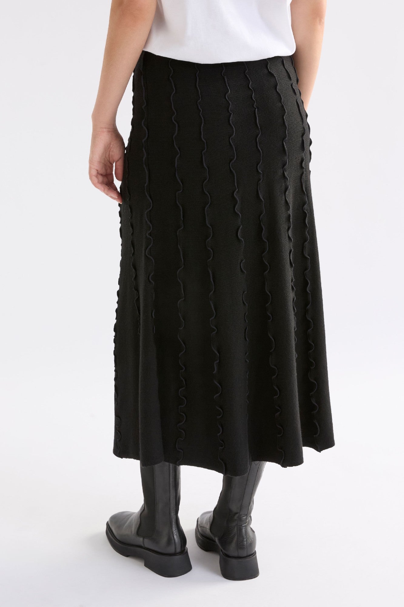 An essential piece for refined work-to-weekend styling, the ELK Skirt Knit Musse - Black blends comfort with contemporary elegance. Designed with an A-line silhouette and a distinctive ruffled knit texture, this midi-length skirt skims the body for a flattering fit while maintaining a relaxed flow. The high-waisted design and encased elastic waistband ensure ease of wear, making it a versatile staple for any wardrobe. Whether paired with the matching Musse Sweater for a coordinated look or styled with a crisp tee and sneakers for an effortless off-duty outfit, this skirt delivers timeless appeal.