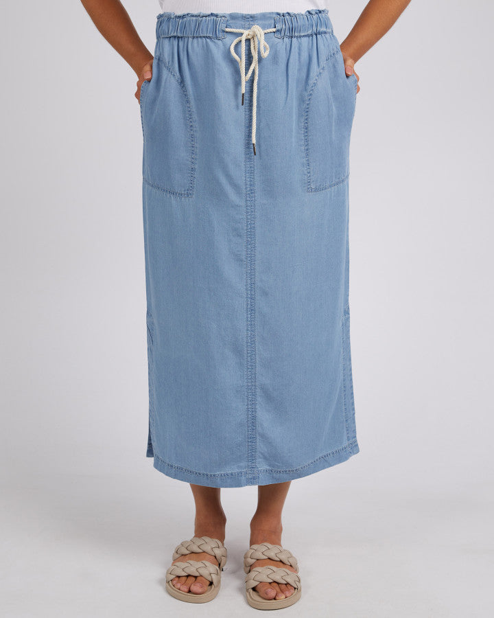 The Elm Penny Utility Skirt in Mid Blue Wash is a versatile and stylish addition to your wardrobe. Crafted from soft denim, this mid-length skirt features side pockets, side splits, and an elasticated waist with a drawstring for ultimate comfort and a flattering fit. Its design is reminiscent of our bestselling travel skirt, offering both style and practicality.