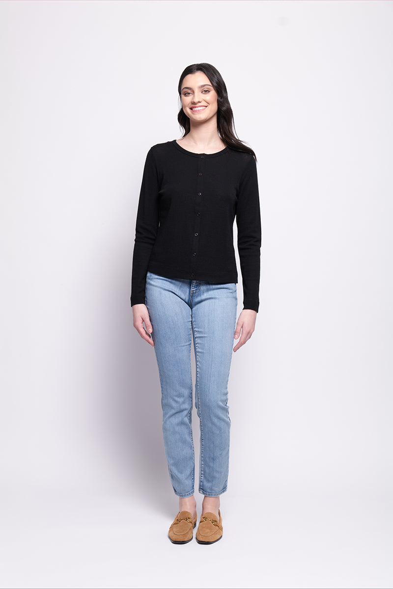 Timeless sophistication meets luxurious comfort with the Foil Cardigan Time Wool Tell - Black, crafted from 100% merino wool. This versatile cardigan offers a sleek, classic look, perfect for layering through the seasons.