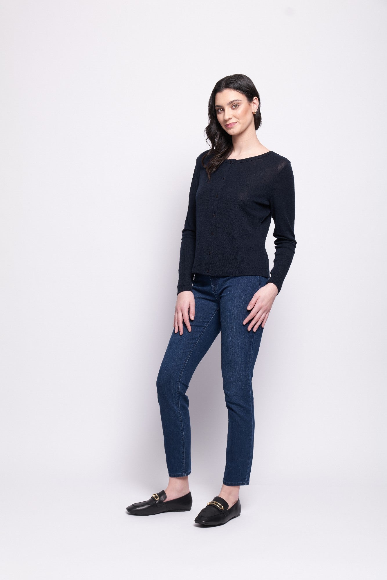 Pair the Foil Cardigan Time Wool Tell - True Navy with tailored trousers for a professional ensemble or wear it over a simple tee with jeans for casual elegance. This cardigan transitions seamlessly from work to weekend.