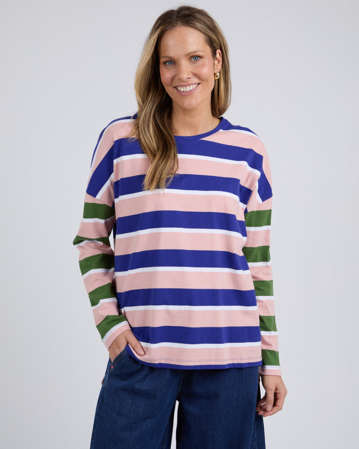 The Elm Long Sleeve Tee Ribbon - Pink & Blue Stripe is the perfect blend of casual comfort and playful style. Featuring a bold multi-colour stripe pattern with contrast sleeves, this long-sleeve tee brings a fun, fresh twist to your everyday wardrobe. Made from soft cotton jersey, it’s lightweight, breathable, and easy to wear all year round.
