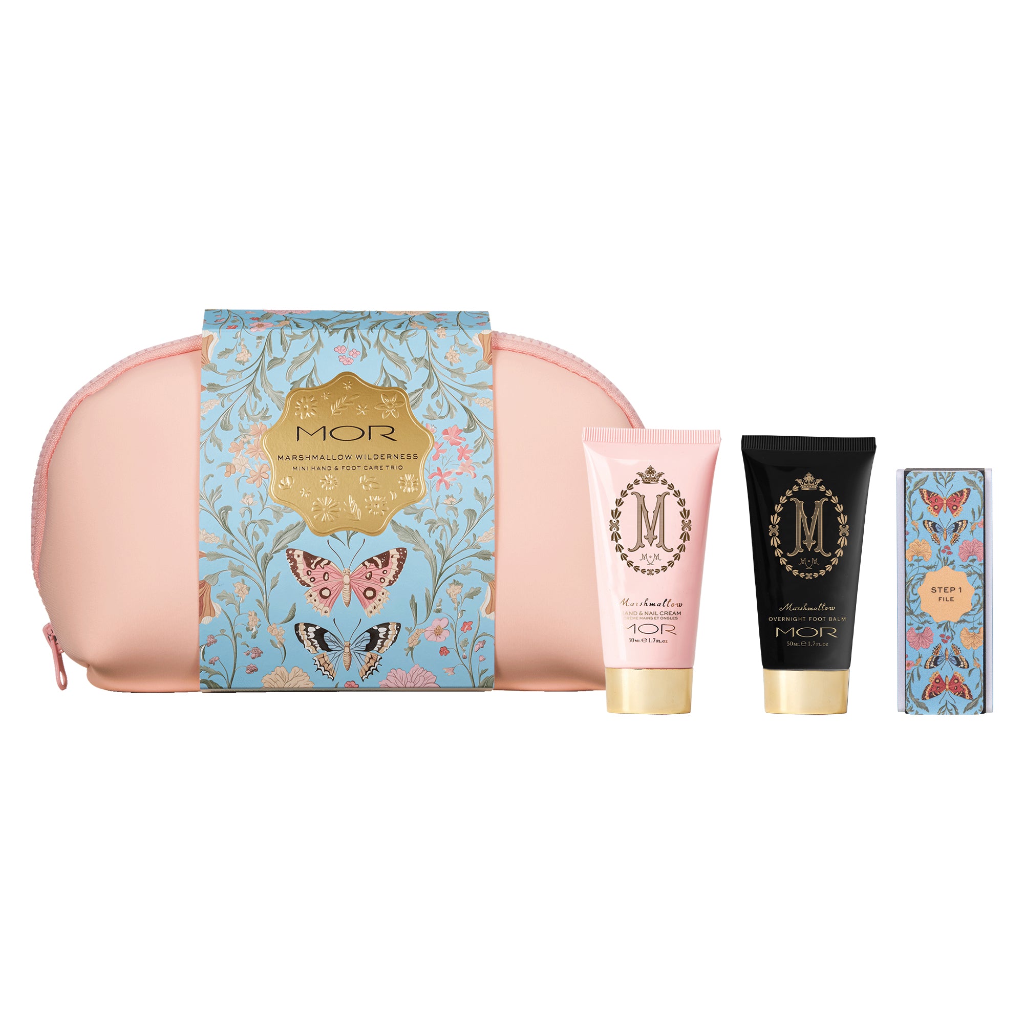 Pamper yourself or someone special with the MOR Gift Marshmallow Wilderness, a luxurious set designed to care for hands and feet. Beautifully packaged in a pastel pink cosmetics bag with a floral and butterfly design, this gift set combines indulgent skincare with elegant presentation, making it the perfect treat or thoughtful present.