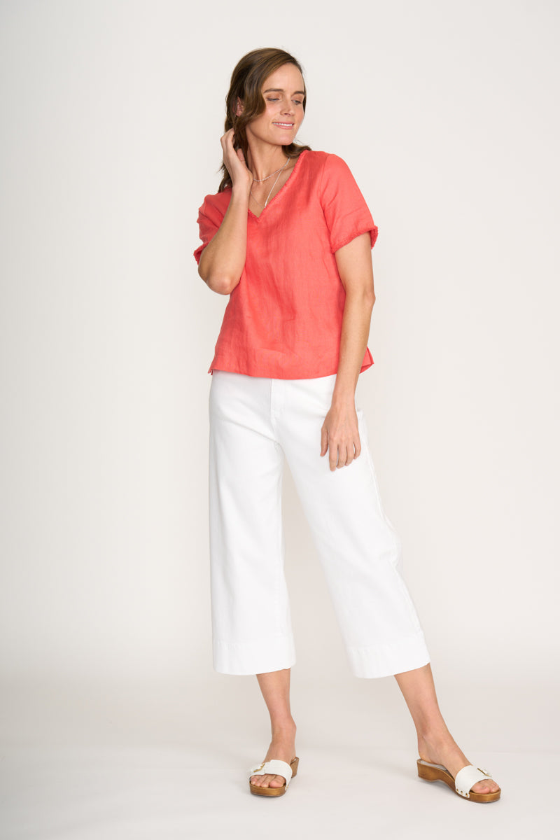 The Foil Top V Benefits - Melon is a refreshing linen top that brings easy elegance to your wardrobe. Designed with a flattering V-neckline and raw edge detailing, this piece is light, breathable, and perfect for warmer days.