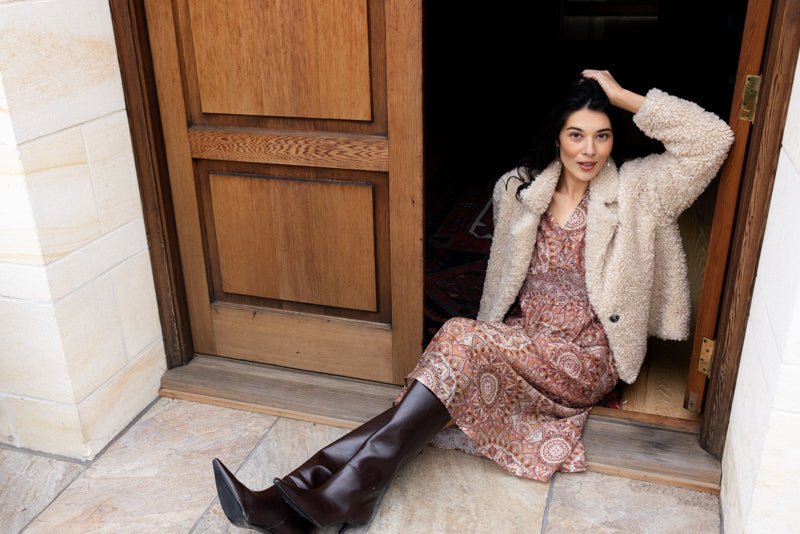 Lou loves this dress worn with tall boots and a simple coat. The warm tones make it perfect for autumn and winter dressing while still feeling light and feminine.