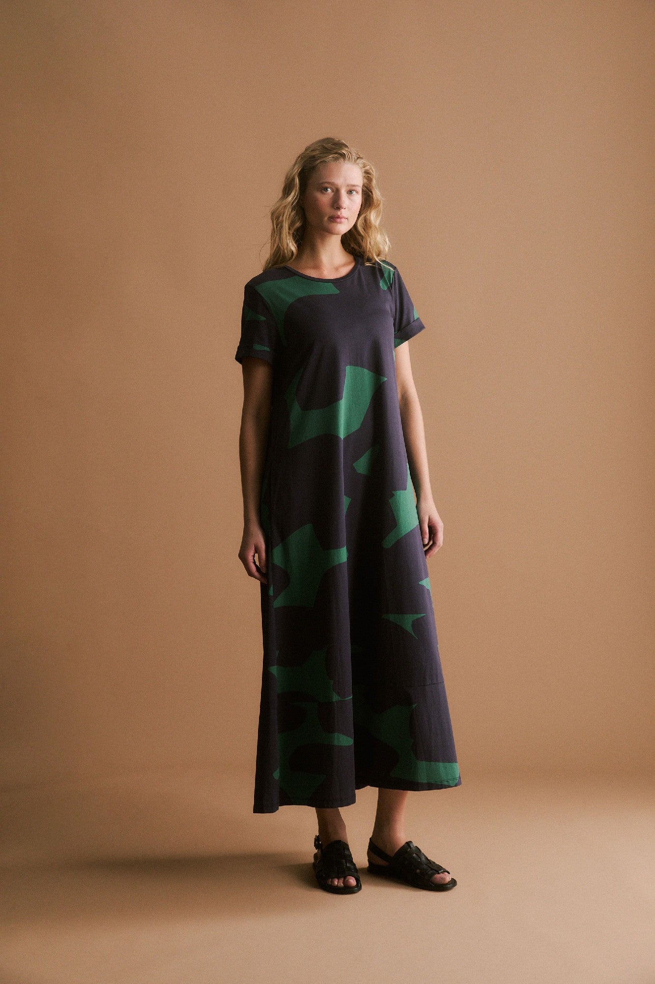 Effortlessly modern and statement-making, the ELK Dress Haki – Teal Terra brings bold print and everyday ease together in one versatile piece. Crafted from breathable organic cotton in ELK’s exclusive abstract teal and navy design, this maxi-length t-shirt dress is cut with a relaxed regular fit that gently flares into an A-line silhouette. A wardrobe hero that balances style with practicality, it’s perfect for work, weekends, and travel.
