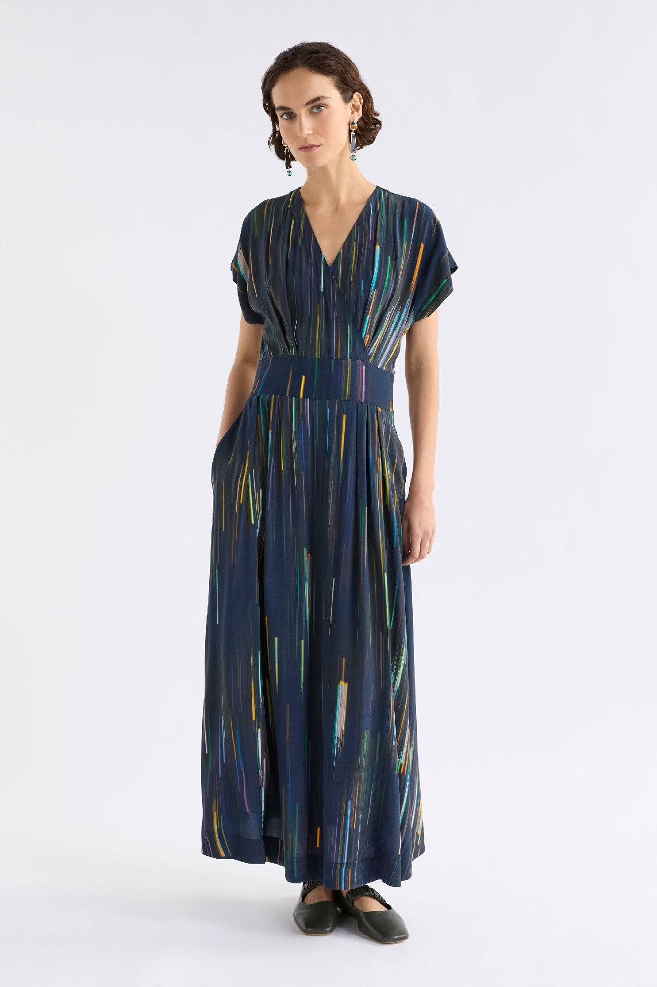 Turn heads in the ELK Dress Kayra - Alinea Print, a modern midi with a soft wrap-look bodice and a wide, waist-defining panel. The painterly Alinea print—streaks of vibrant colour on a deep navy base—adds refined drama, while the fluid skirt and in-seam pockets keep it effortlessly wearable from day to evening.