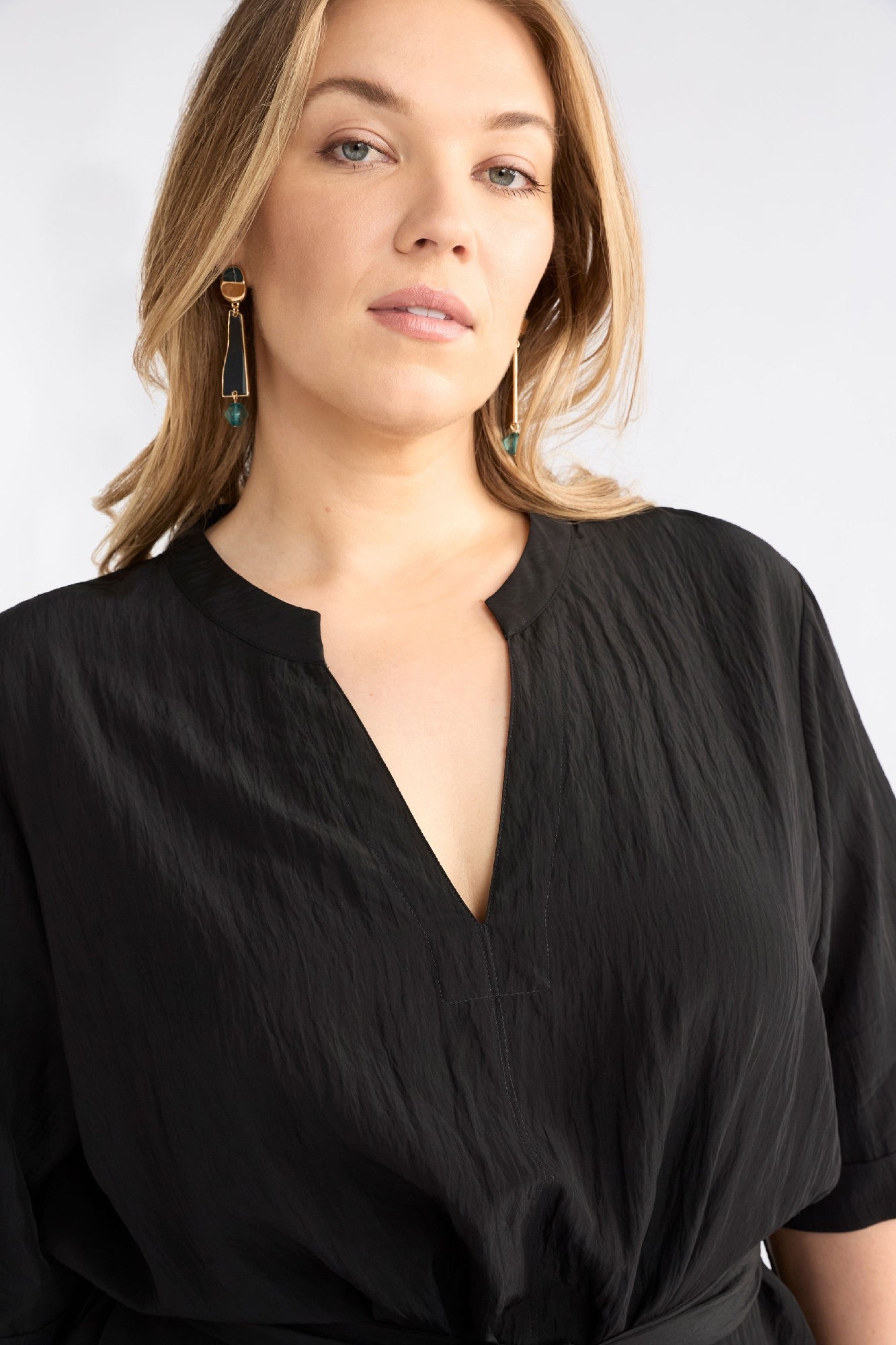 Wear the ELK Dress Kysten - Black with a ballet flat or ankle boot for easy styling. Cinch the waist with the tie for a more polished look or leave it loose for relaxed days. Layer with a cropped knit or denim jacket in cooler weather.