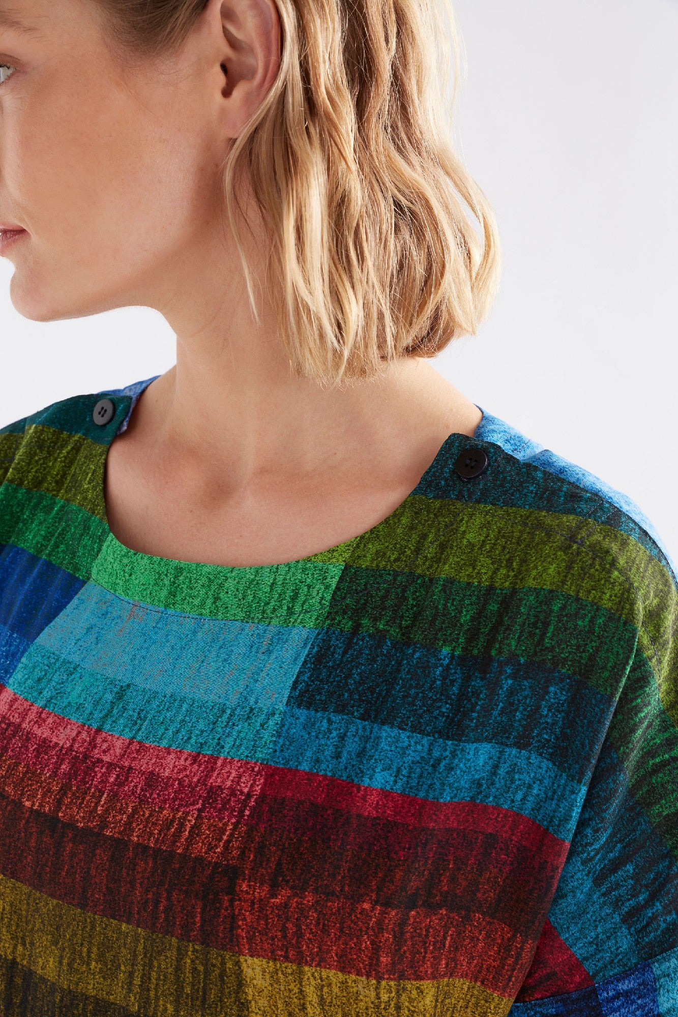The ELK Dress Sono - Komi Print is a relaxed, easy-fitting shift dress bursting with colour and contemporary charm. Crafted from a lightweight textured viscose, this short sleeve dress features ELK’s exclusive Komi print — a bold, artistic rainbow stripe in rich, painterly tones. Designed for comfort and wearability, it includes side seam pockets and a gently curved hemline that finishes above the knee.