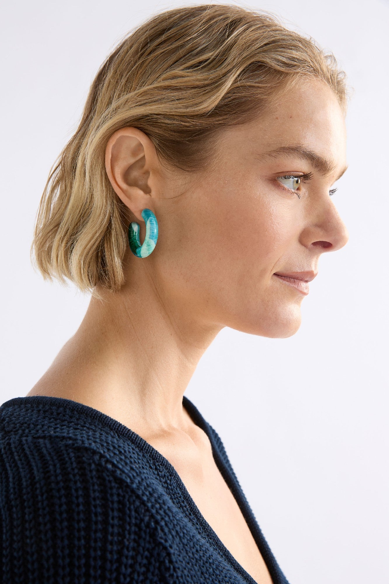 Let the ELK Resso Hoop Earrings in Komi Green shine against a white blouse, navy knit, or linen dress. They pair beautifully with both neutrals and coordinating greens, or as a playful contrast to prints in ELK’s seasonal palette.