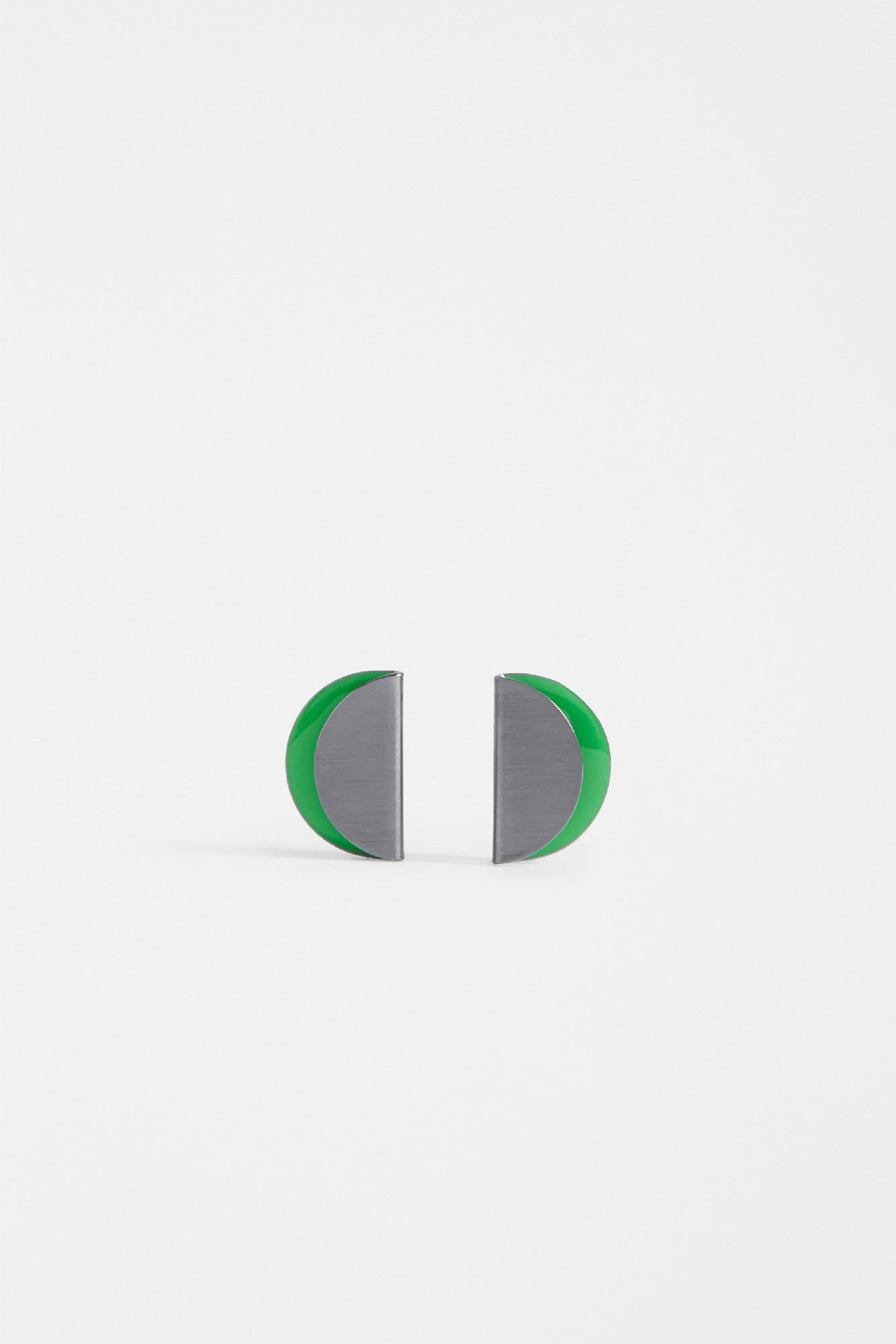 Bold, vibrant, and ultra-modern, the ELK Earrings Vikta Hoop - Electric Green delivers a striking pop of colour with its sculptural, half-moon shape. The contrasting brushed metal exterior and glossy enamel interior create a visually dynamic look, making these earrings a statement piece that’s lightweight and easy to style.