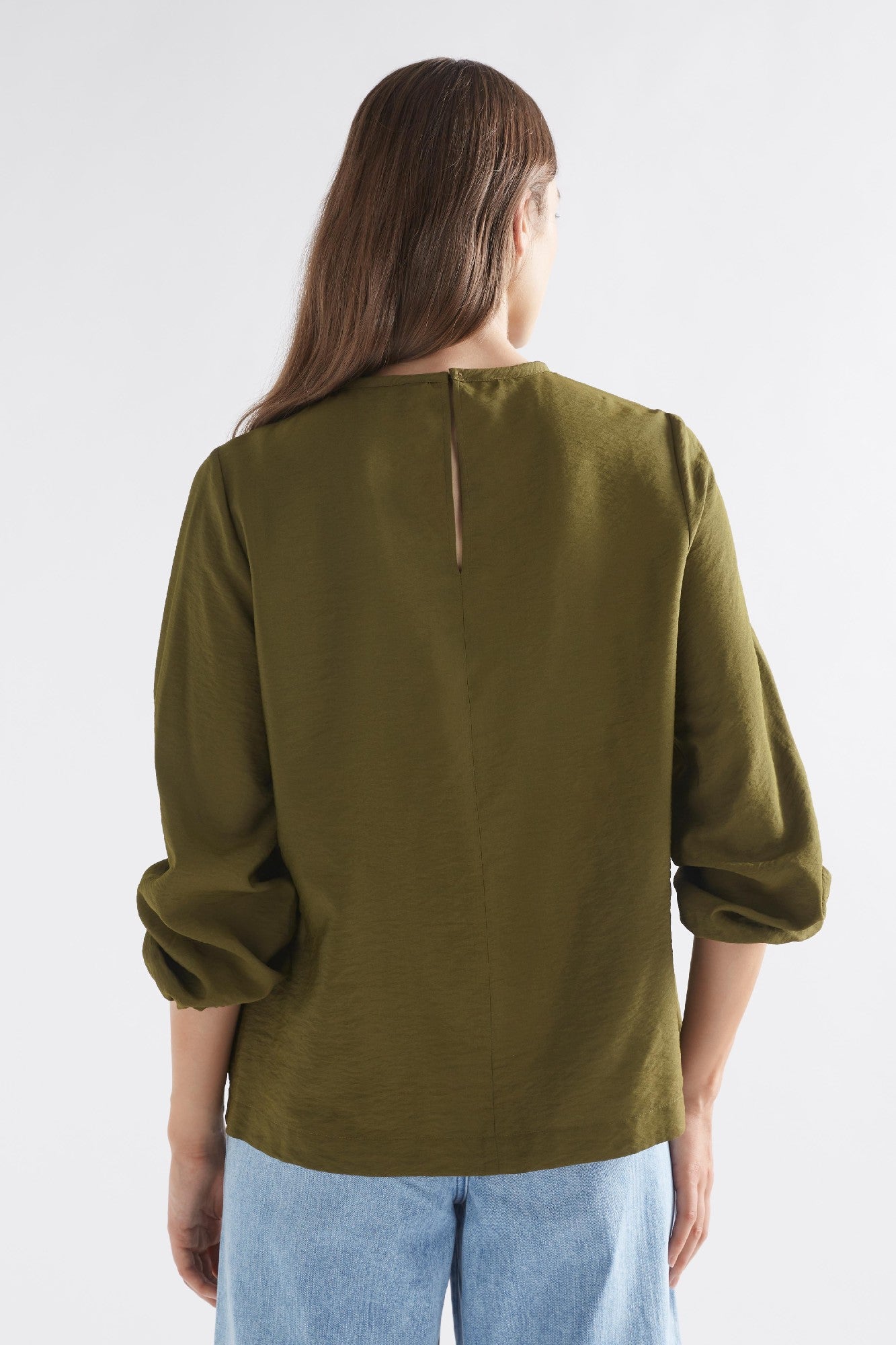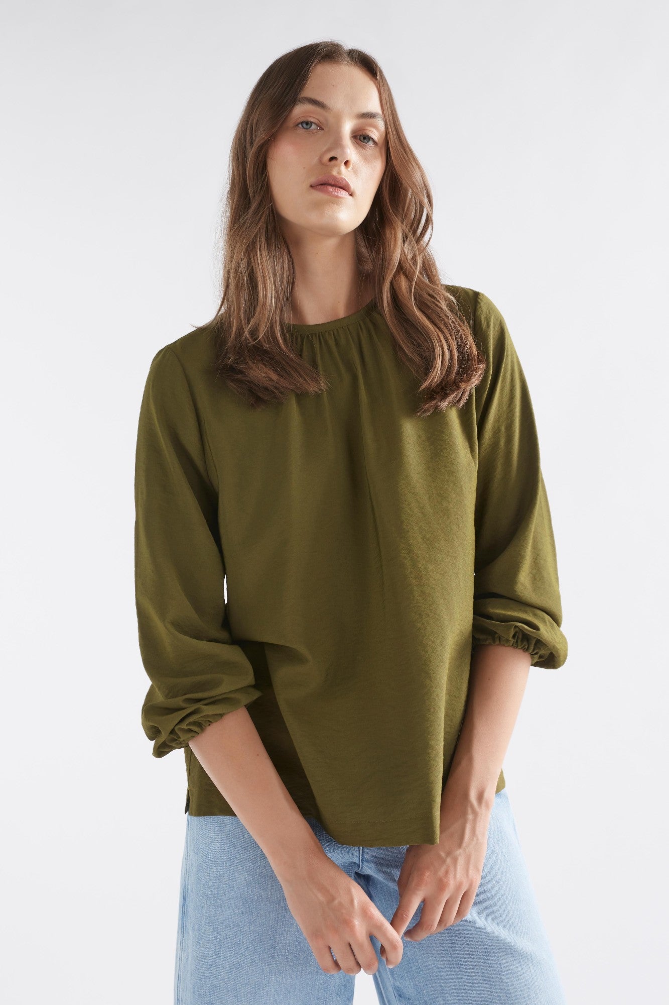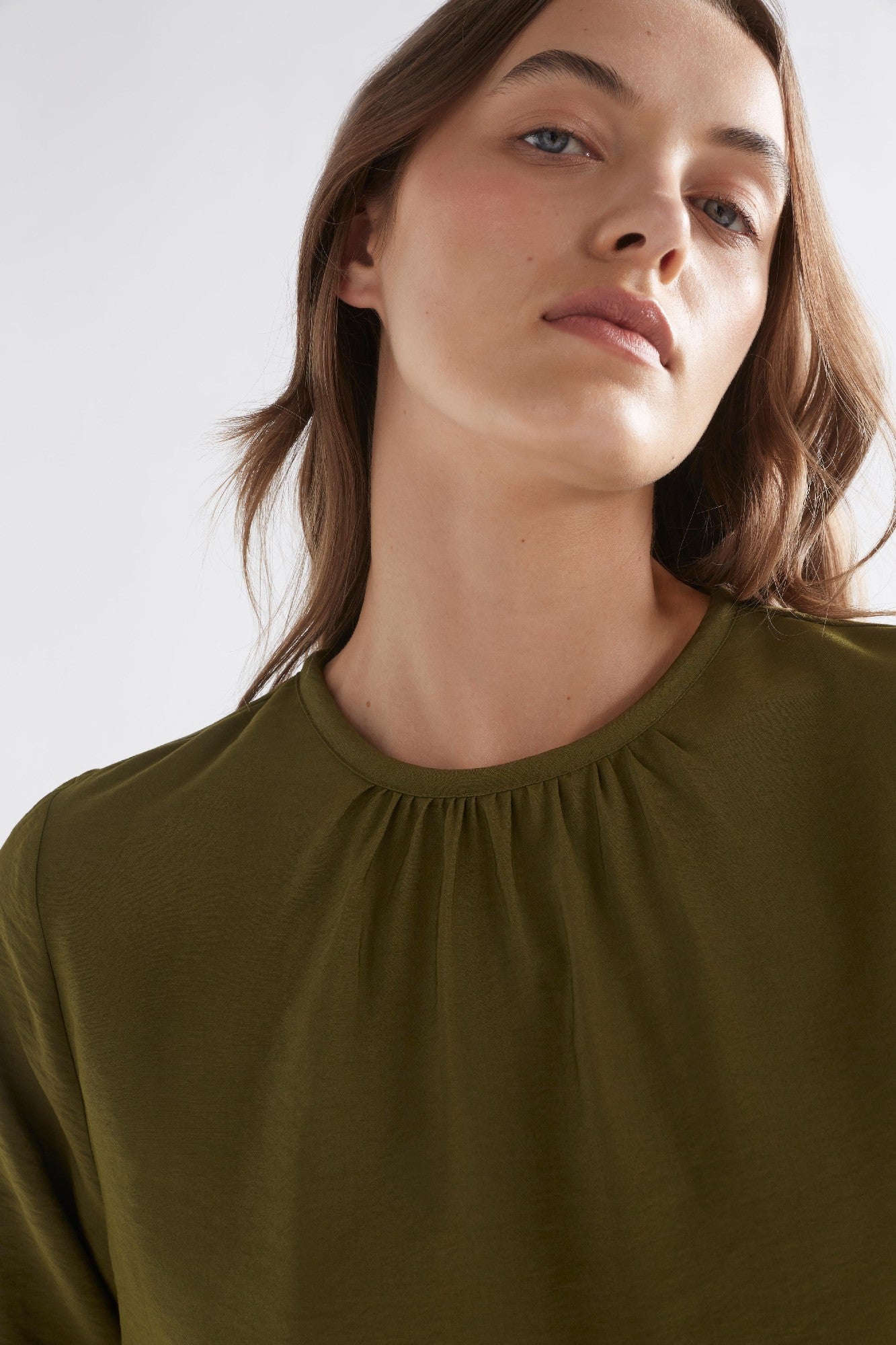 The Elk Top Etne Dark Olive is an elegant wardrobe staple that balances everyday ease with subtle sophistication.