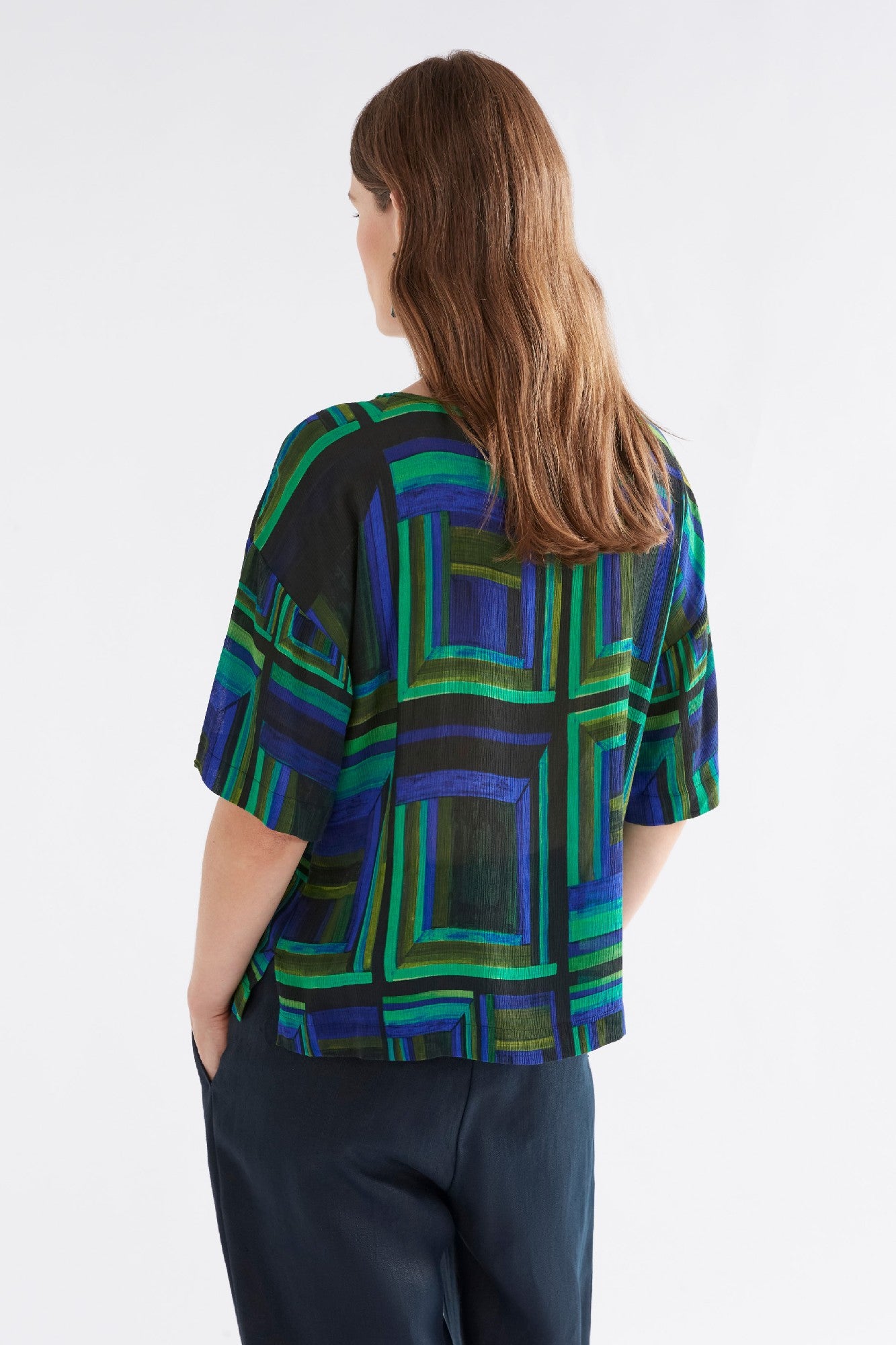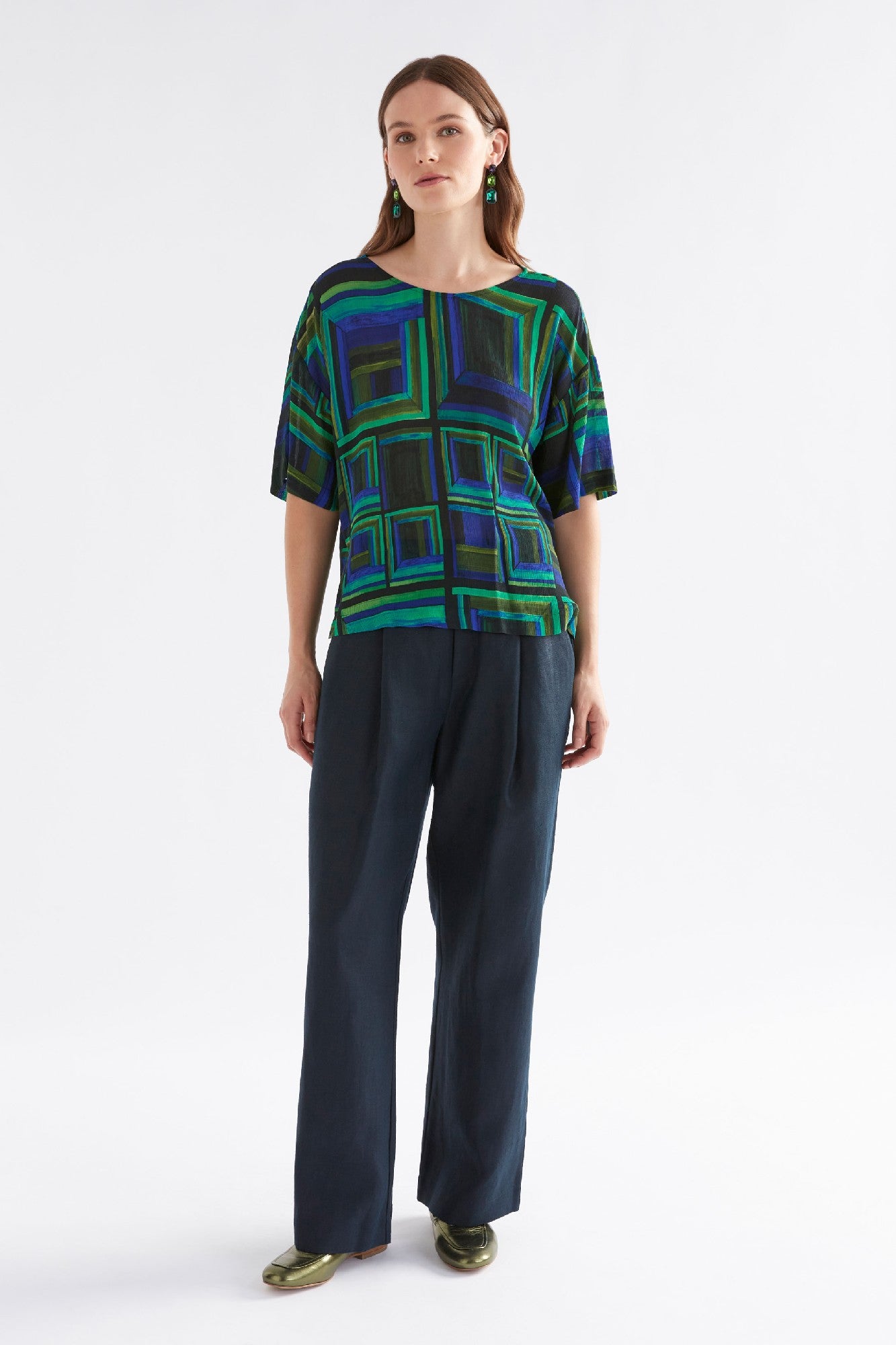 The Elk Soma Top in Salone Print is a vibrant and artistic addition to any wardrobe. Featuring an exclusive geometric design in striking shades of green and blue, this top is a statement piece that combines elegance with comfort. Its lightweight, breathable fabric ensures effortless wear, while the relaxed silhouette and dropped sleeves provide a flattering fit. A perfect piece to add a bold pop of color to your everyday style.