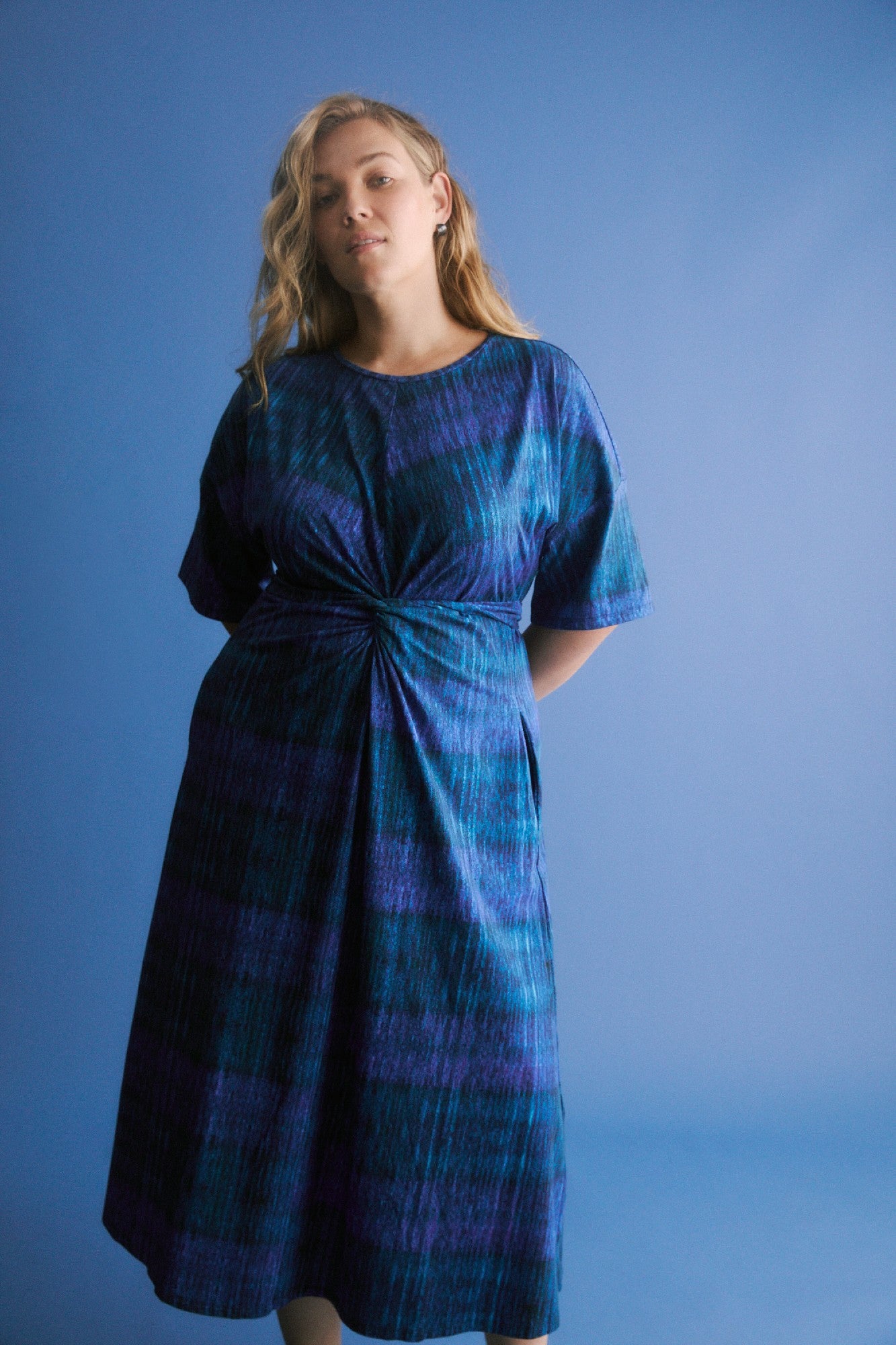 The ELK T-Shirt Dress Kihte - Mikko Print is where artful design meets easy, everyday wear. Featuring ELK’s exclusive Mikko print in vivid blue-green tones, this relaxed midi dress is elevated by its clever front twist and asymmetric hemline—an effortless piece with just the right amount of edge.