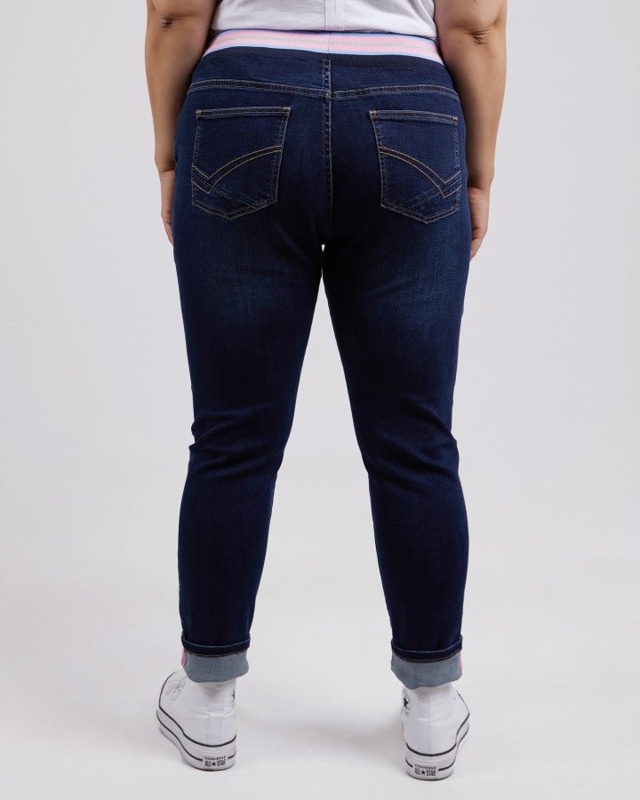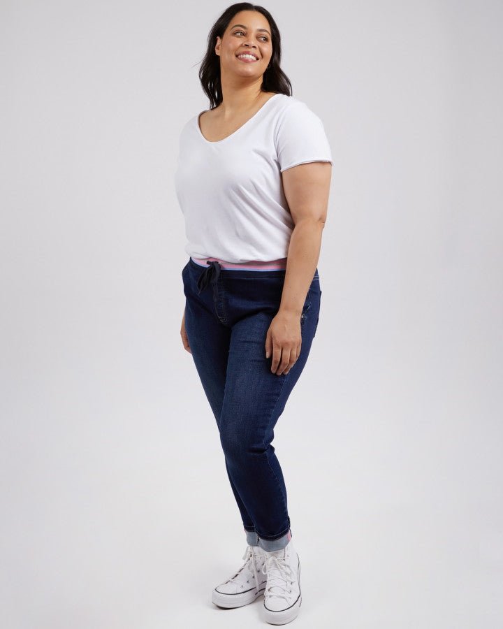 The Elm Jogger Melody Denim - Indigo is your go-to for effortless comfort and style. Designed with a relaxed fit and a sporty striped elastic waistband, these denim joggers combine casual chic with everyday wearability. Featuring a tapered leg, roll-up cuffs, and a functional drawstring, they are the perfect blend of denim jeans and jogger pants for an on-the-go lifestyle.