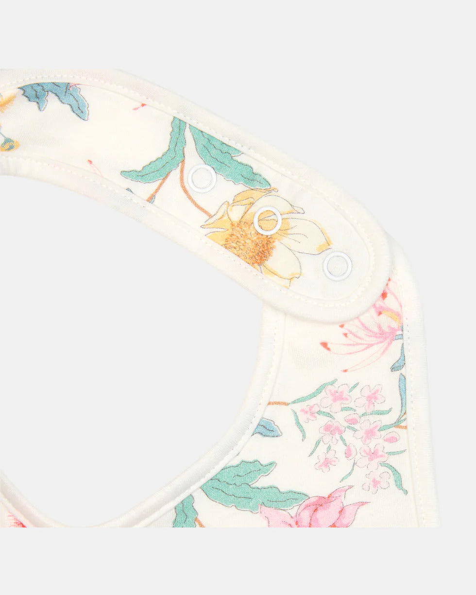 The TOSHI Baby Bib Down Under - Waratah Dawn brings together beautiful Australian-inspired design with the softness and practicality Toshi is known for. Crafted from premium 100% cotton, this bib is gentle on delicate skin while keeping your little one clean and comfortable. The reverse features an absorbent cotton towelling layer for moisture protection, making it perfect for mealtime, dribbles, and teething. Featuring an exclusive Waratah Dawn print of native blooms and butterflies, this bib adds a touch of charm to every outfit.