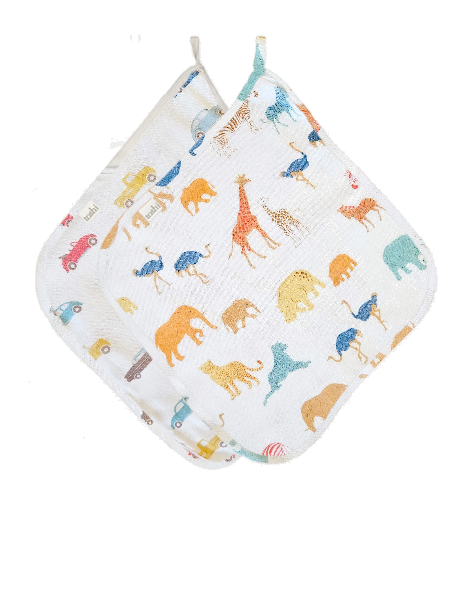 The TOSHI Muslin Baby Washcloths - Congo are luxuriously soft and beautifully practical, making them a must-have for every parent. Crafted from the finest 100% cotton muslin, these lightweight cloths feature an open weave that is gentle on delicate baby skin while being highly absorbent and quick drying. Each set includes two charming designs — playful Congo animal and vintage car prints — adding a touch of fun to bath time, mealtime, or nappy changes.