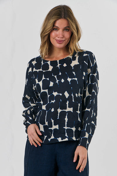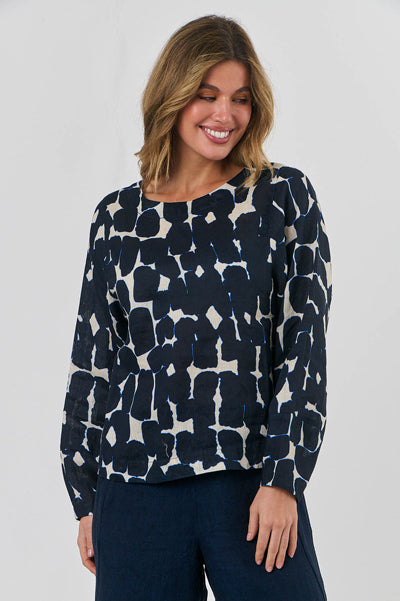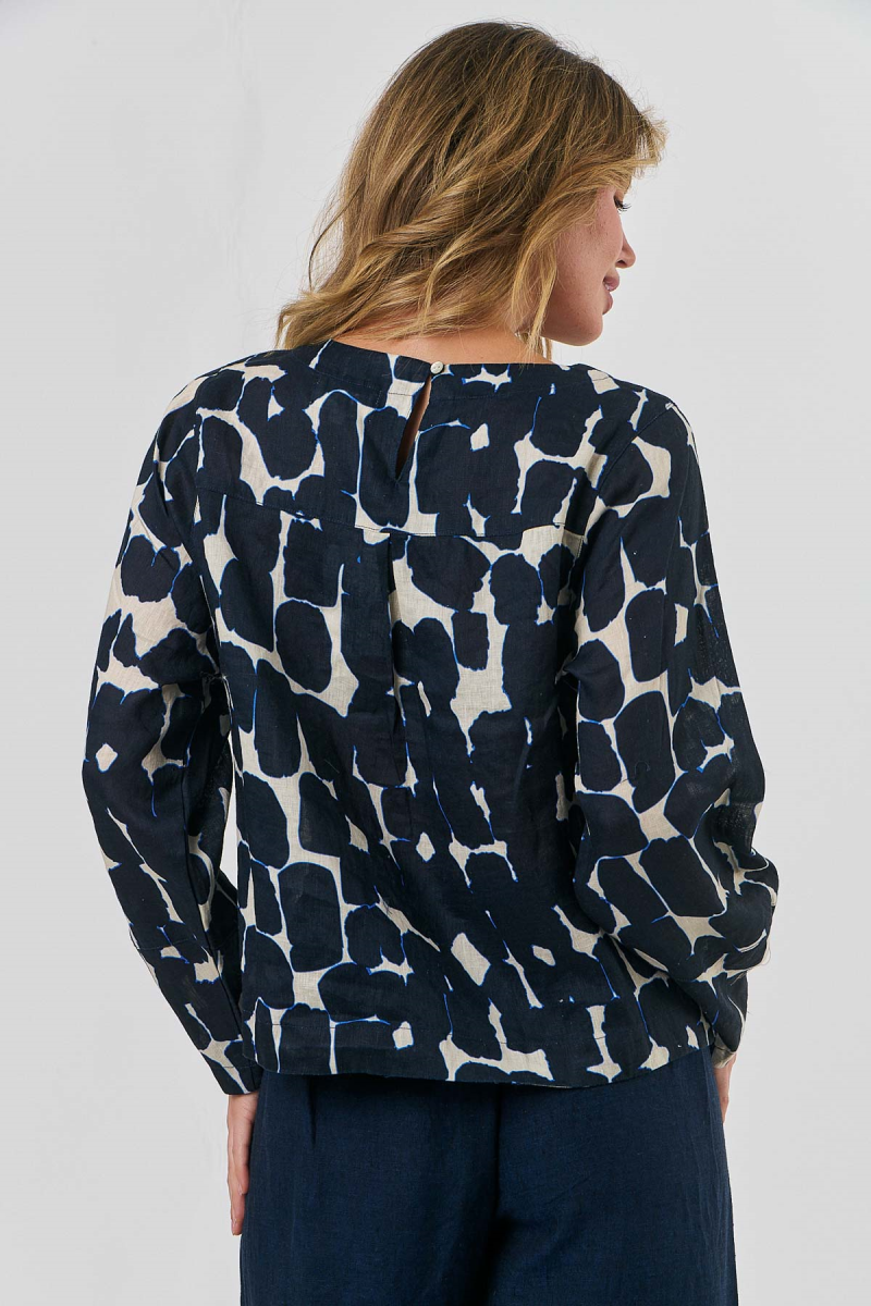 Bring a modern touch to your wardrobe with the Naturals Top Long Sleeve 576 Eclipse. Featuring a bold, artistic print and a refined back button closure, this linen top is a stylish and versatile addition to your collection.