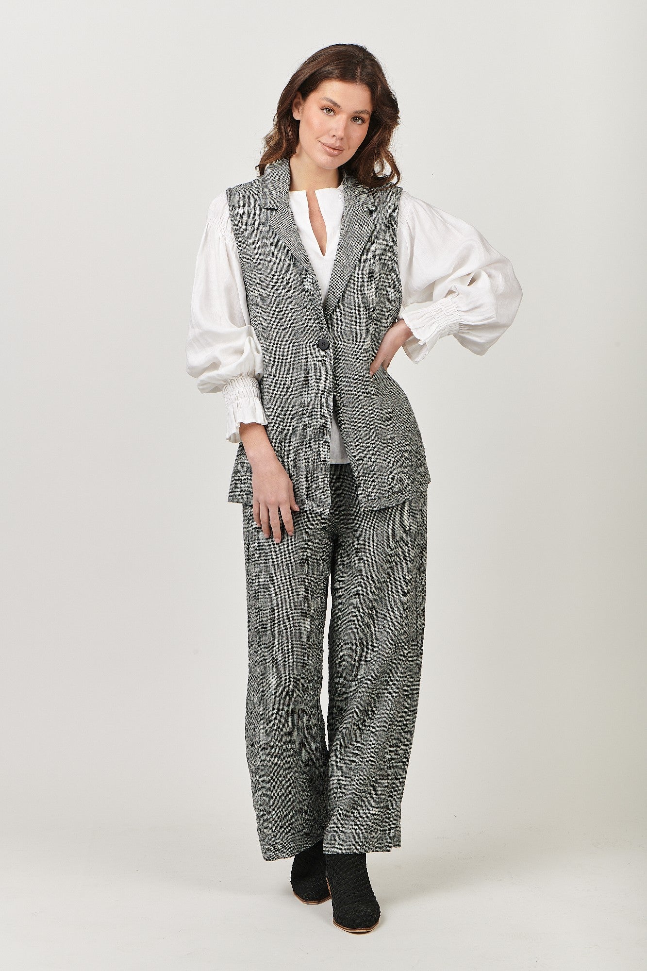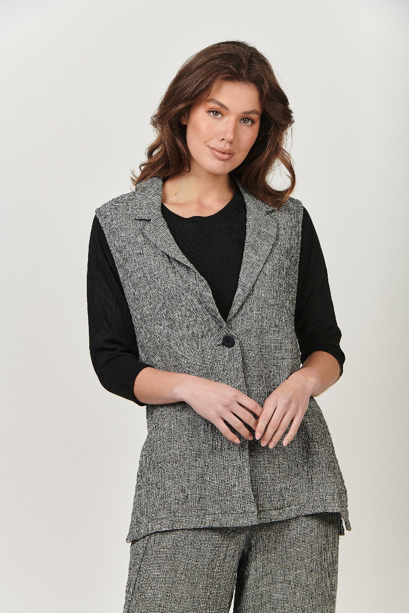 Chic and versatile, the Naturals Vest Puppytooth 501 brings timeless structure and texture to your wardrobe. Crafted from a breathable linen blend in a subtle puppytooth check, this tailored vest layers beautifully over shirts, tees, or dresses. A trans-seasonal piece that balances polish and ease — available online from Pink Poppies Living Creatively, your Stanthorpe boutique for Australian-designed fashion.