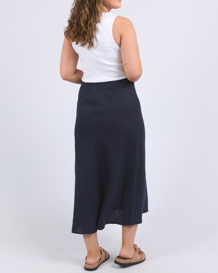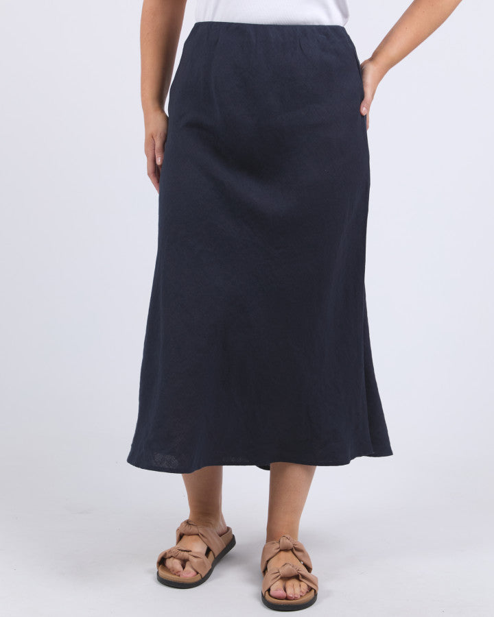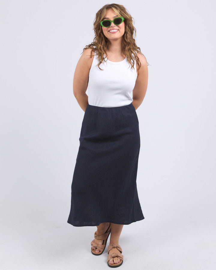 The Elm Skirt Eleni - Dark Sapphire is a versatile staple that will take you from workdays to weekends with ease. Crafted in a soft dark sapphire linen blend, this flattering A-line skirt is designed to skim the body and provide effortless comfort for everyday wear. Its simple yet elegant silhouette makes it a timeless piece for your wardrobe.