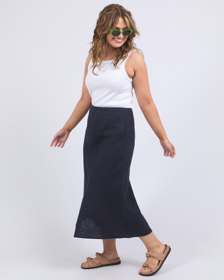 Pair the Elm Skirt Eleni - Dark Sapphire with a simple tank or tee for a casual weekend look, or elevate it with a linen blouse and sandals for summer outings. For cooler days, add a denim jacket and sneakers for relaxed layering.