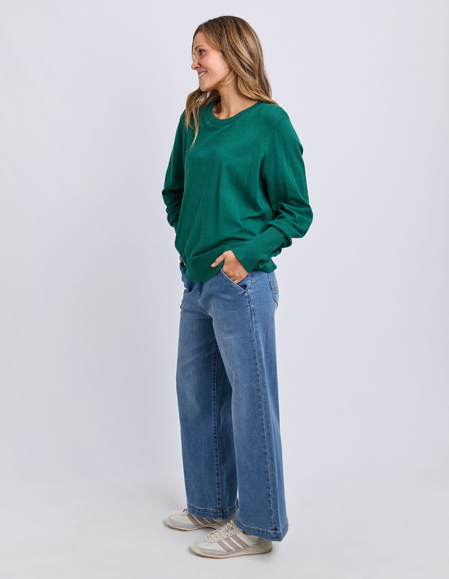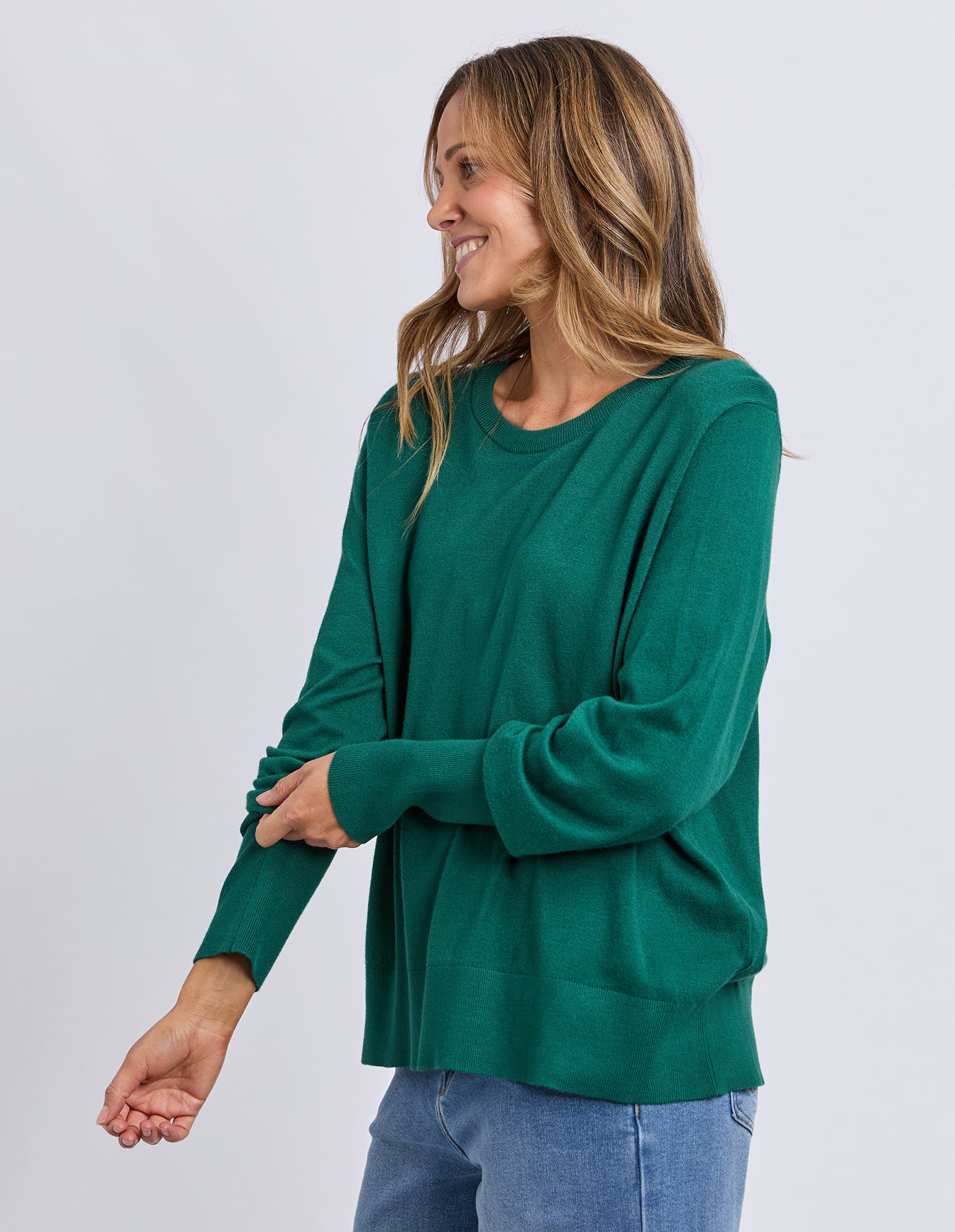 Lou loves this rich turquoise shade with mid-wash denim and tan accessories — it’s a colour that feels fresh but still grounded. Perfect for those cool Granite Belt mornings when you want comfort without losing that pop of personality.