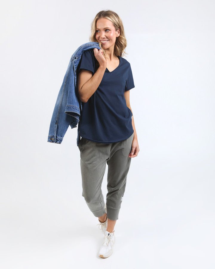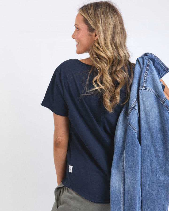 The Elm Tee Pima Vee – Navy is a timeless piece that combines premium comfort with versatile styling – an absolute must-have for your Elm collection at Pink Poppies