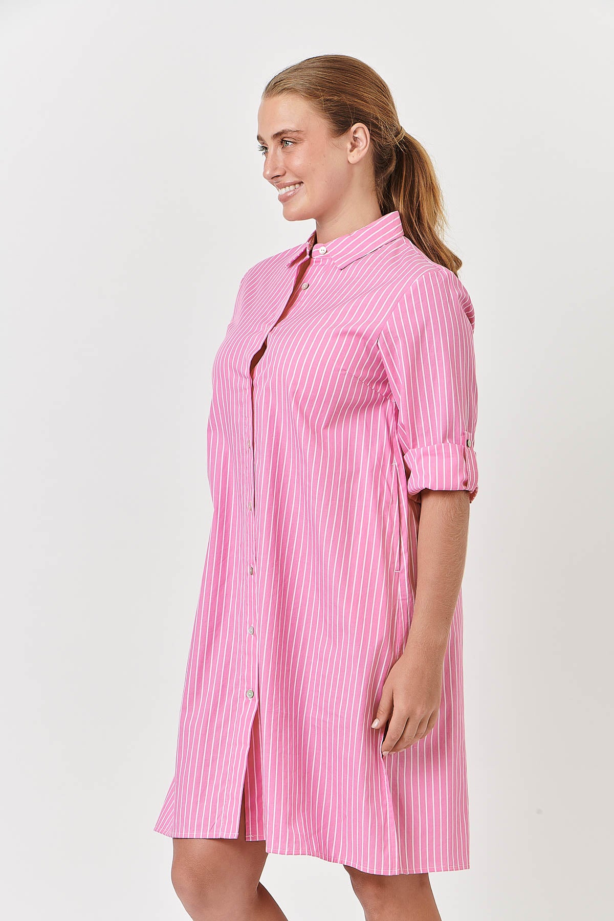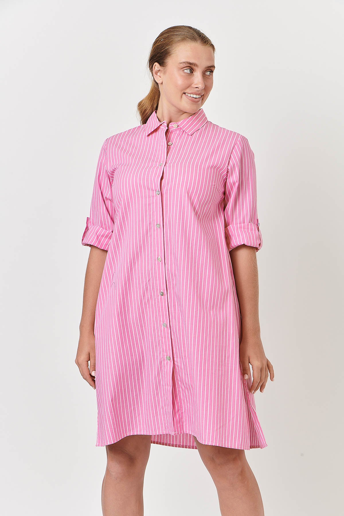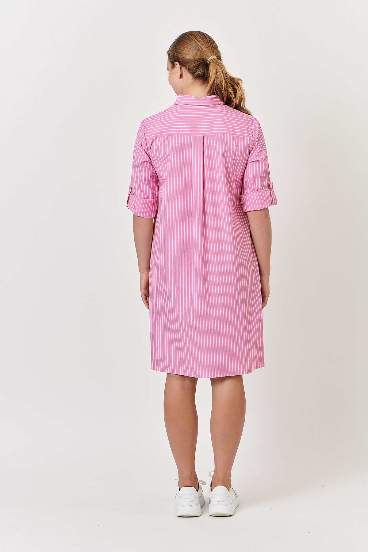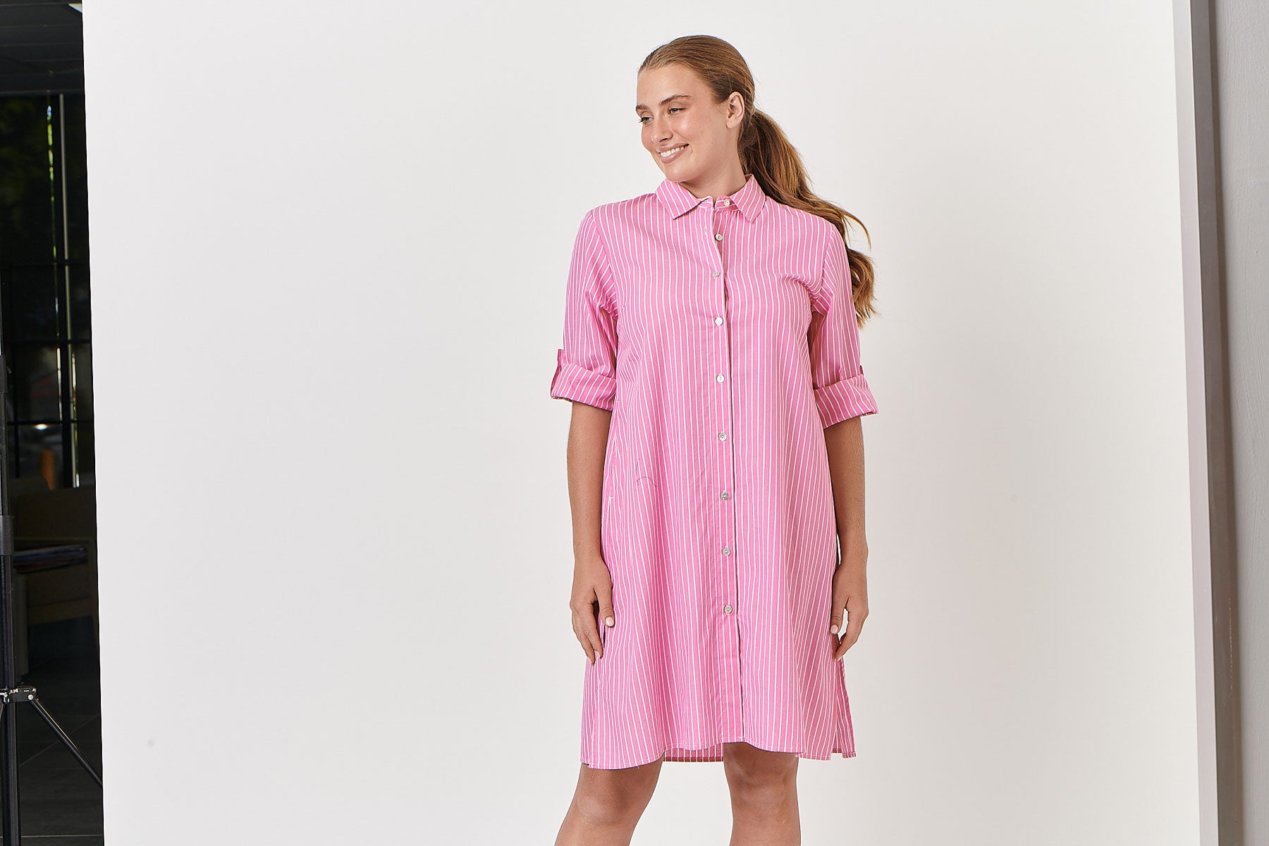 Pair the Enveloppe Dress Poplin – Fuchsia with white sneakers for a fresh everyday look, or elevate it with tan heels and statement jewellery for a polished finish. On cooler days, throw over a denim jacket or layer with tights and ankle boots.