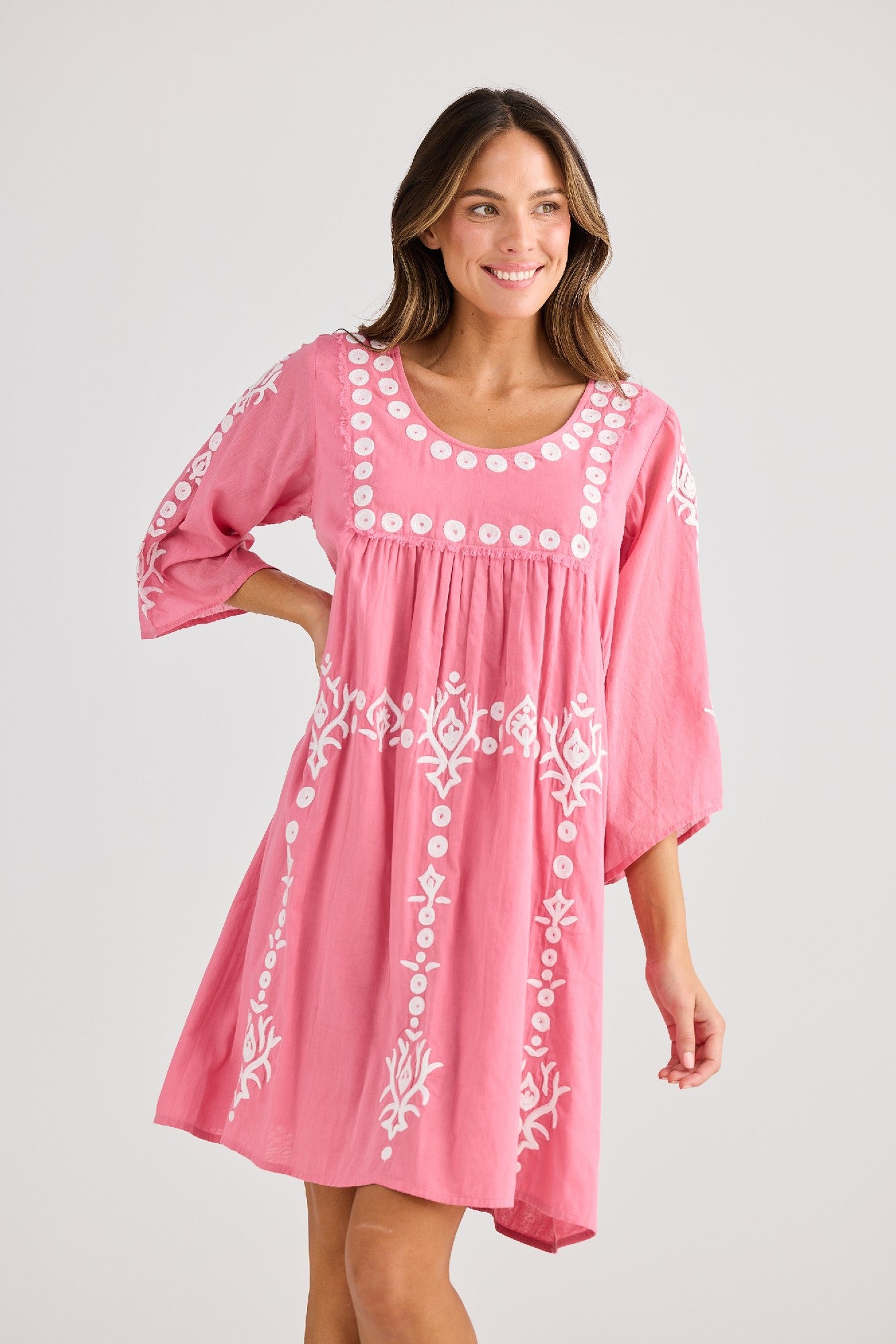 Bright, breezy, and fun, the Holiday Dress Sun Lounge – Cosmo Pink is the perfect mini dress for summer days. Designed in a relaxed fit with a flattering round neckline, this dress features bold embroidery detail and handy front pockets, making it as practical as it is stylish. The vibrant cosmo pink shade adds a playful pop of colour to your warm-weather wardrobe.