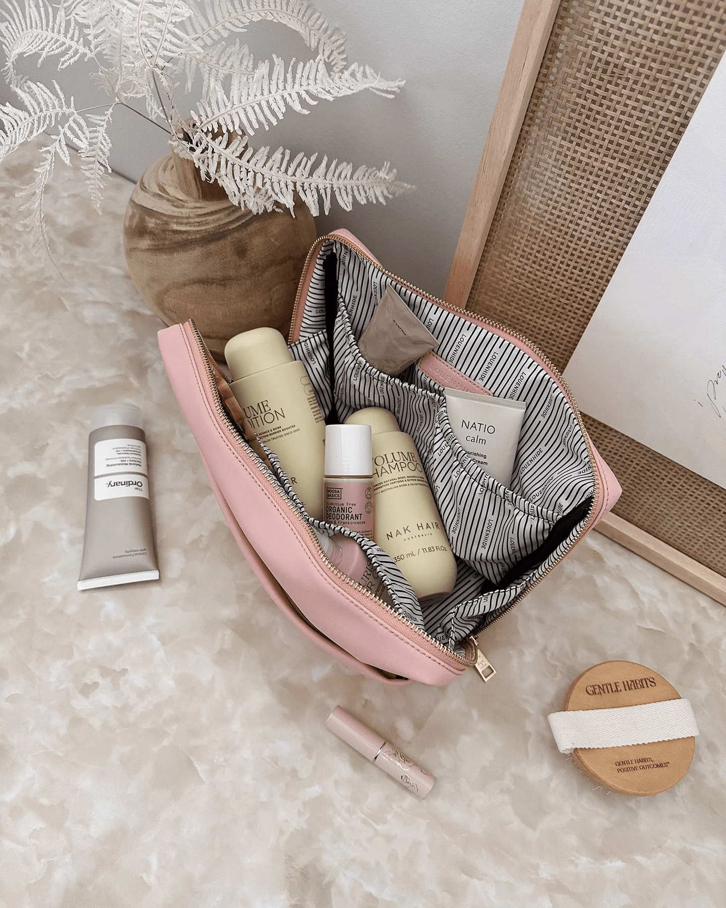 Lou’s Favourite: I love this one for travel – it holds full-size bottles, stands up beautifully on the vanity, and the pink is just soft enough to feel feminine without being overpowering.