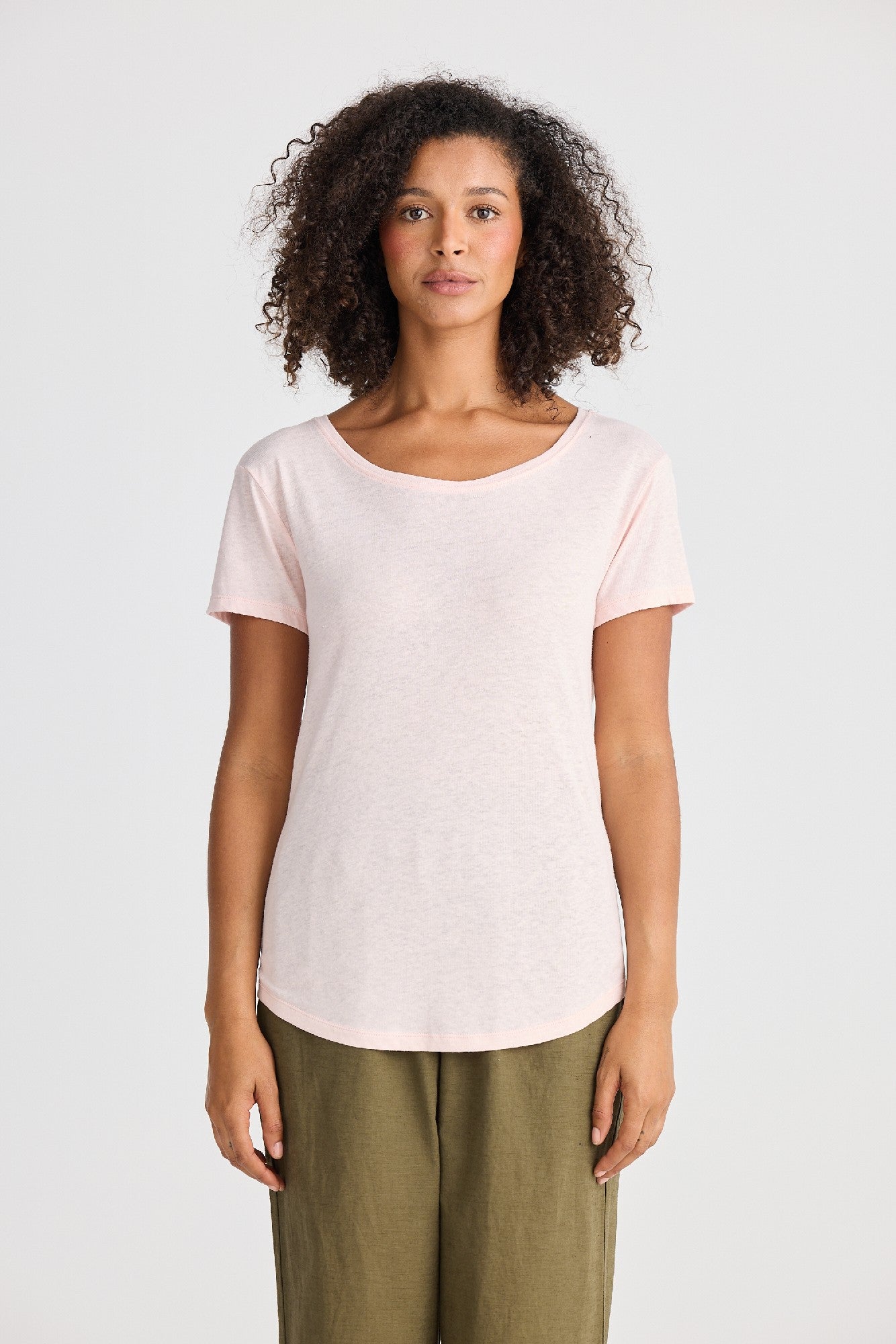 Simple and versatile, the Shanty Tee Monza – Pink is a timeless wardrobe essential crafted from a soft linen-cotton jersey blend. Featuring a round neckline, classic fit, and short sleeves, this breathable tee is designed for everyday comfort with an effortlessly chic finish.