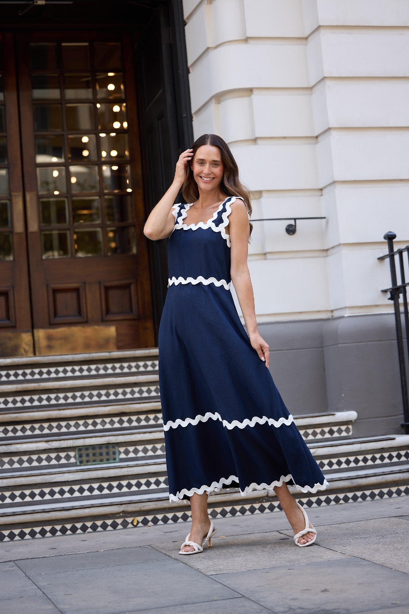 Timeless, elegant, and irresistibly feminine—the Brave & True Dress Marlo Midi - Navy brings effortless sophistication to your wardrobe. Crafted in a breathable linen-viscose blend, this flowing A-line silhouette features a flattering square neckline, wide straps, and charming ric rac trim for a touch of vintage whimsy. Its maxi length and invisible back zip ensure both drama and practicality.