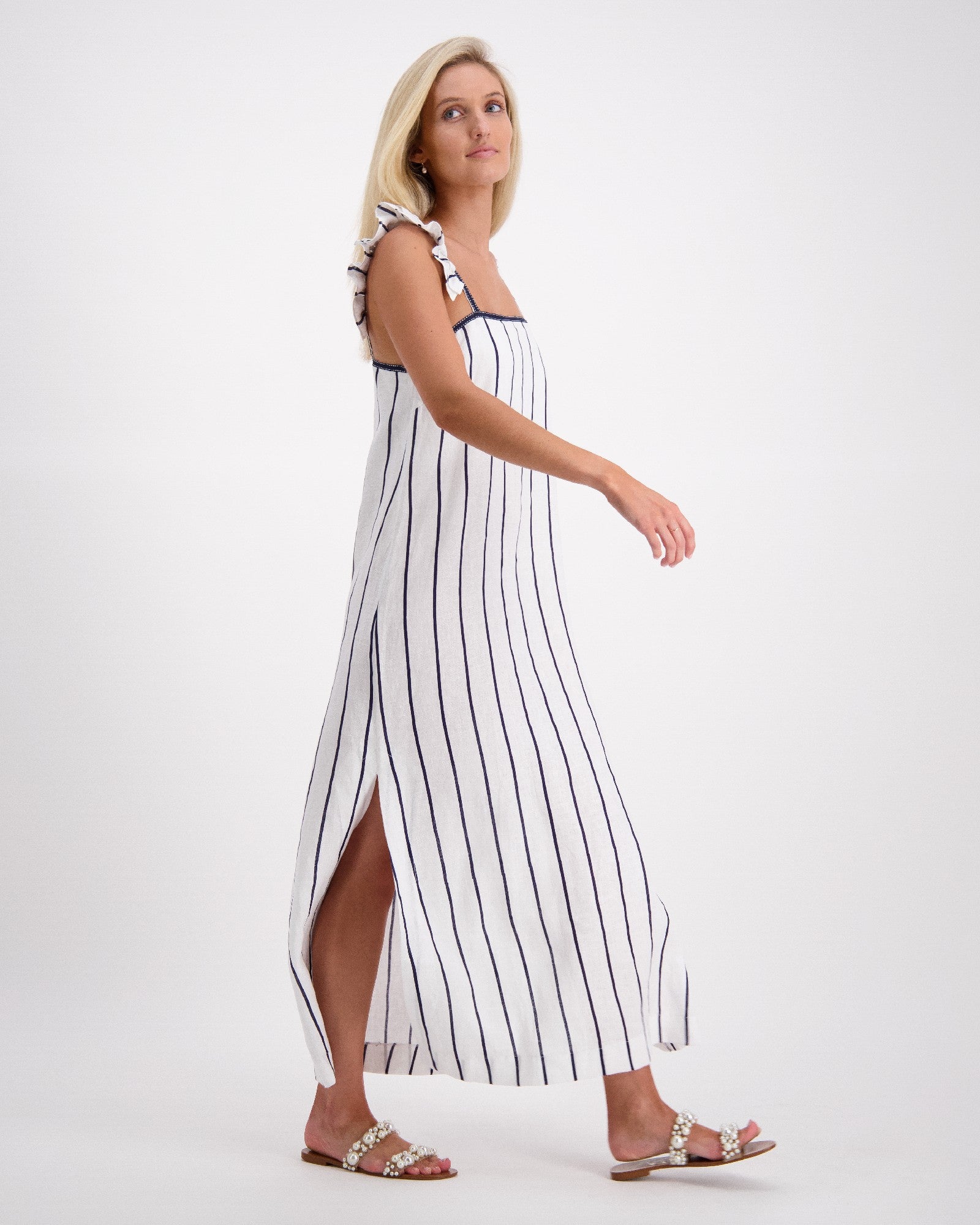 Meta Description: Discover the Luoni Dress Tia with Ribbon in White with Navy Stripe at Pink Poppies. Made from 100% linen, this sleeveless summer dress blends timeless coastal style with natural comfort and effortless elegance.