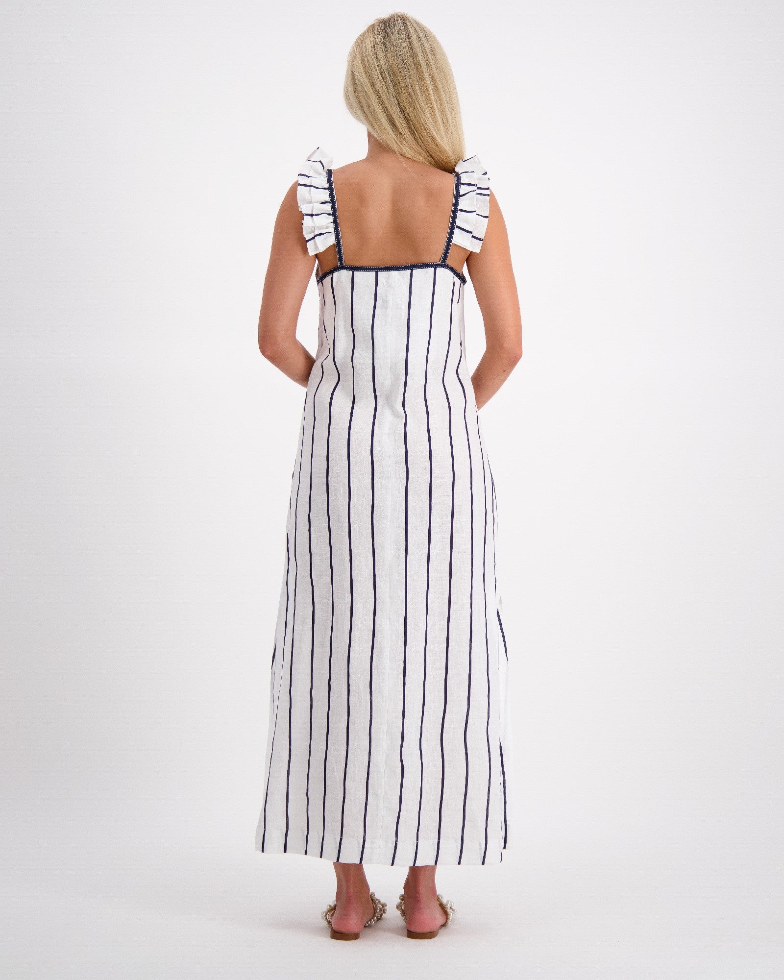 The Luoni Dress Tia with Ribbon – White with Navy Stripe is a beautifully tailored linen dress that combines classic simplicity with modern ease – the kind of piece that feels as good as it looks.