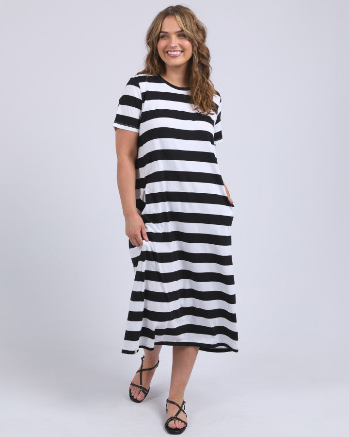 The Elm Dress Adira Stripe – Black & White is a timeless staple that will keep you feeling stylish and comfortable all season long.