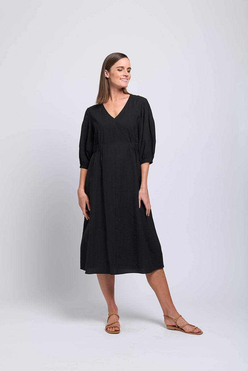- Designed with a flattering V-neckline and midi length for a classic silhouette.