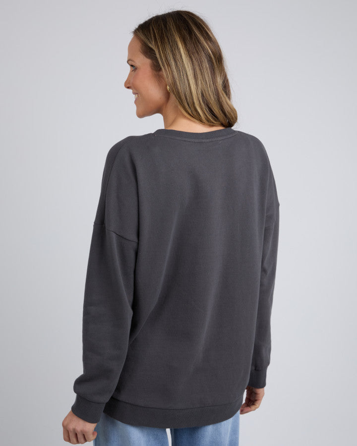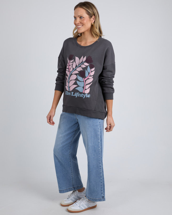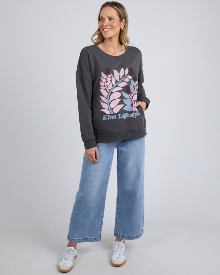 The Elm Crew Keyla - Washed Black is the perfect mix of comfort and statement style. Designed in a relaxed fit, this cosy cotton fleece crew features a bold floral graphic print in soft pink and blue hues with Elm Lifestyle branding. Its washed black colour gives it a vintage-inspired, effortlessly cool look. Whether you're lounging at home or heading out, this laid-back sweater is a must-have for easy styling.
