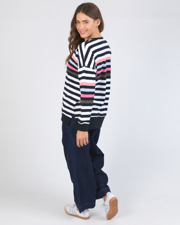 Bring effortless style and playful charm to your everyday wardrobe with the Elm Crew Merriment - Navy & White Stripe. This eye-catching crew features a mix of navy and white stripes, elevated with vibrant pops of pink, blue, and olive for a fresh take on casual dressing. Crafted from soft, cosy cotton fleece, it's your perfect layering piece for the cooler seasons.