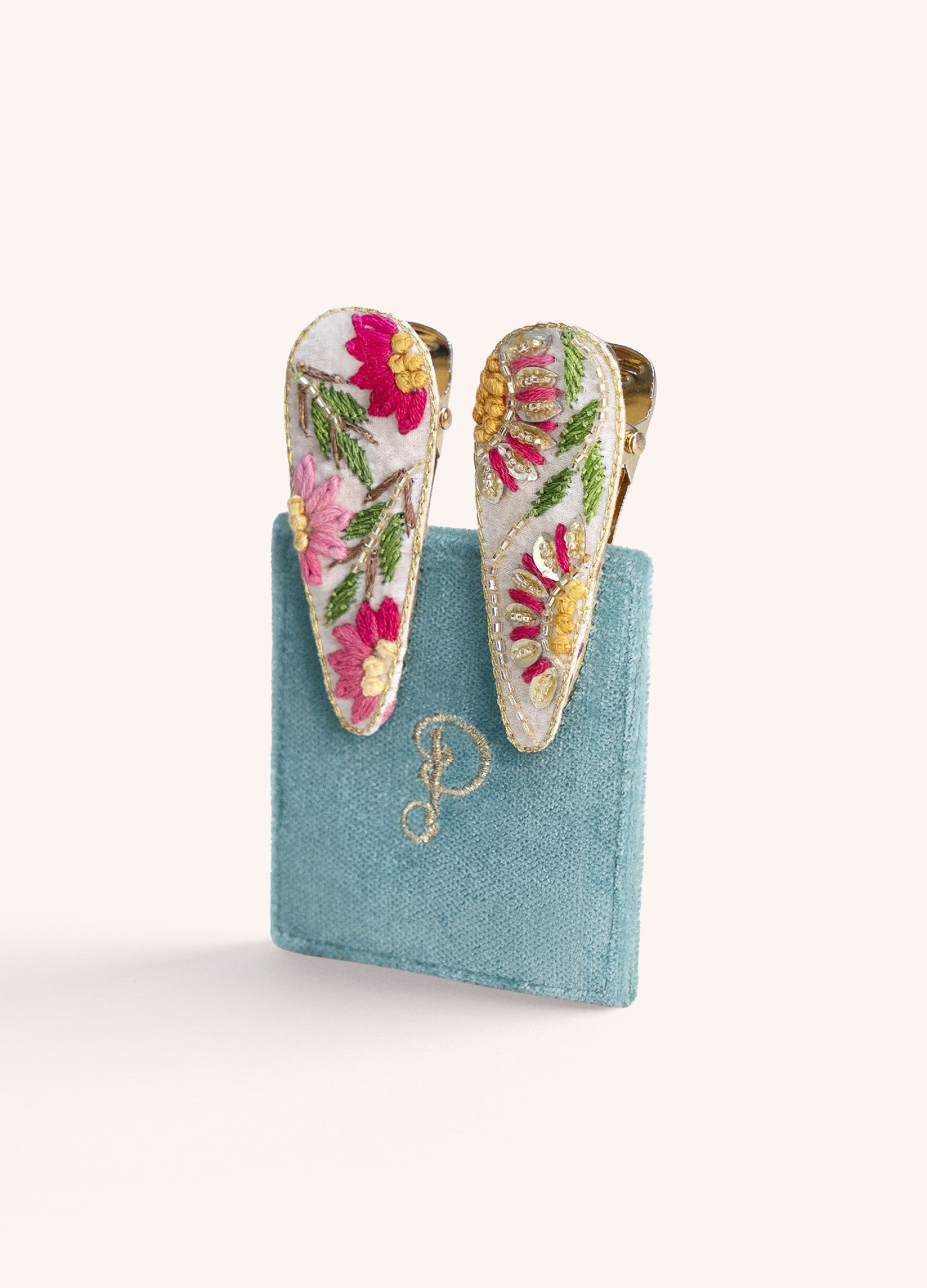 - Set of two coordinating embroidered hair clips