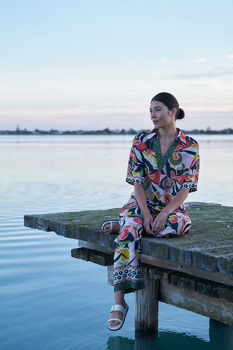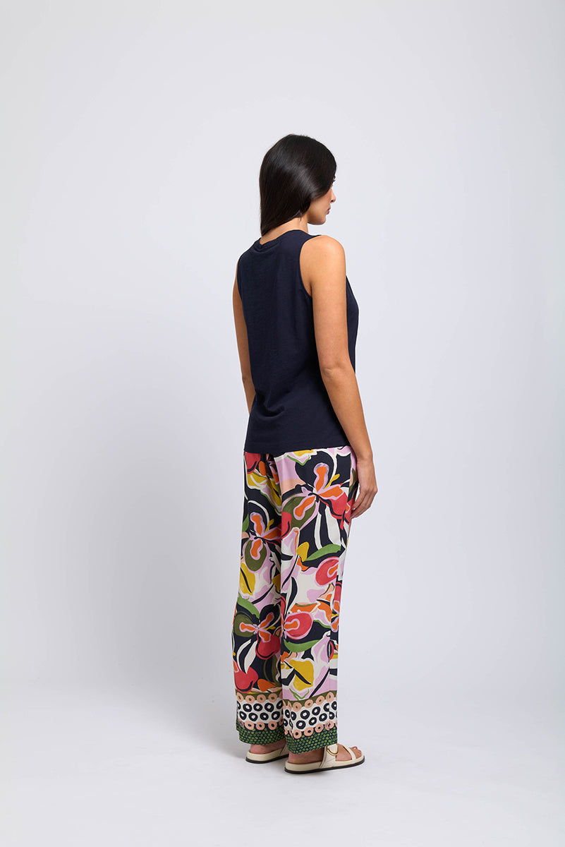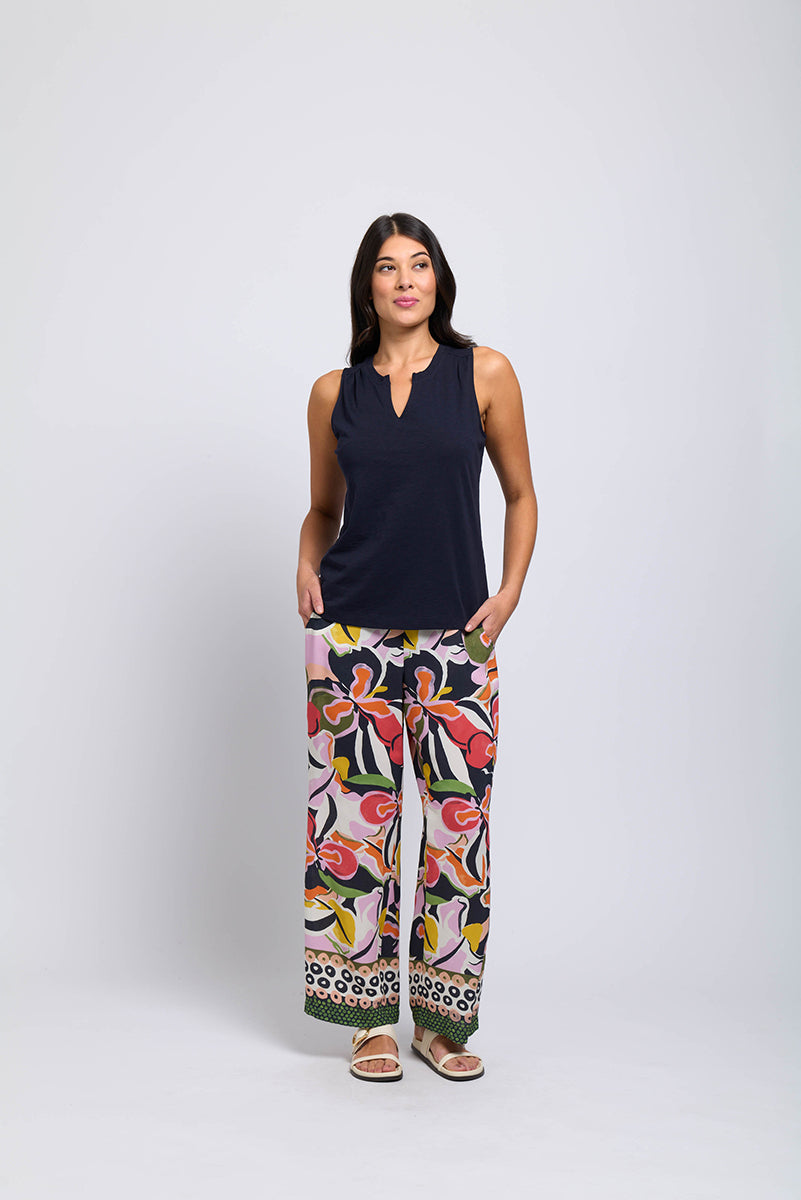 Perfect for both everyday wear and special occasions, the Foil Feature Act Pant - Perennial combines effortless comfort with a touch of elegance. Crafted from 100% viscose, these pants drape beautifully, offering a soft and breathable feel. The flat front waistband with an elasticized back ensures a flattering fit, while the wide-leg design allows for ease of movement. With functional side pockets and a stunning border print, these pants are a versatile addition to any wardrobe.