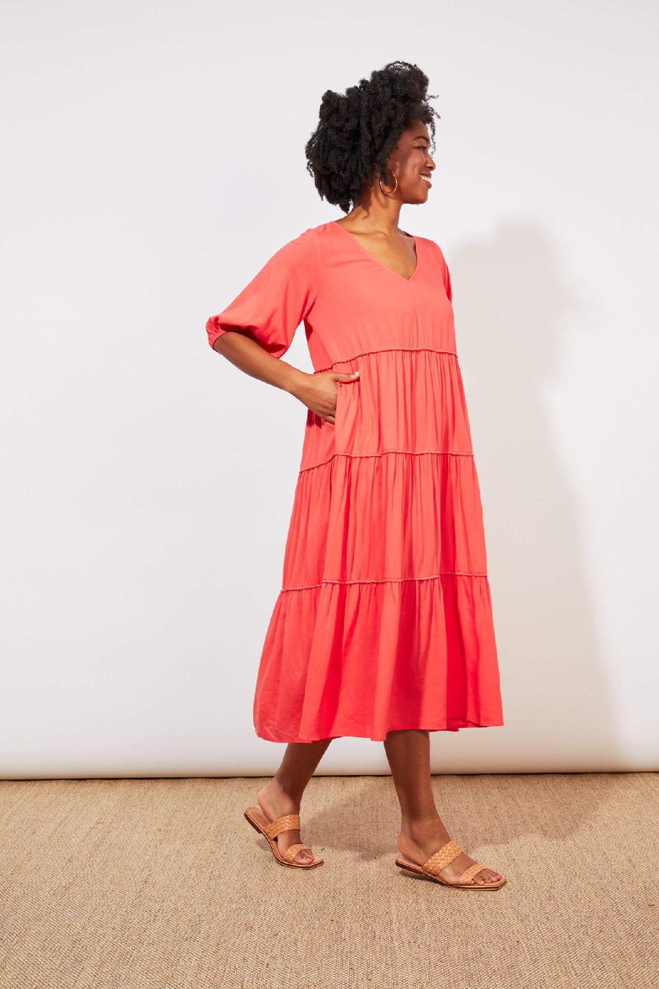 Bright, breezy, and beautifully effortless — the Haven Dress Tropicana Tiered Maxi - Coral is made for sun-drenched days and relaxed summer outings. Crafted from a soft linen-blend fabric, this flowing maxi dress pairs feminine detailing with everyday comfort. With its flattering V-neckline, short puff sleeves, and tiered skirt, it’s the perfect mix of style and ease for picnics, holidays, or brunch with friends.