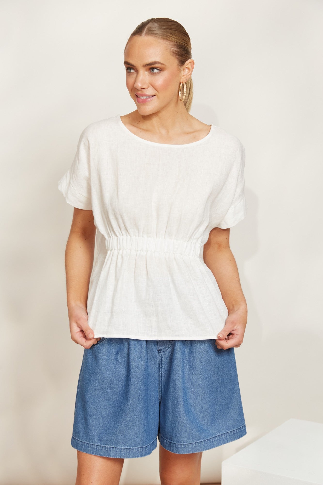 Pair this linen top with wide-leg pants or denim for relaxed everyday wear, or tuck into a linen skirt for a polished coastal look. Add slides and statement earrings for an elevated finish.