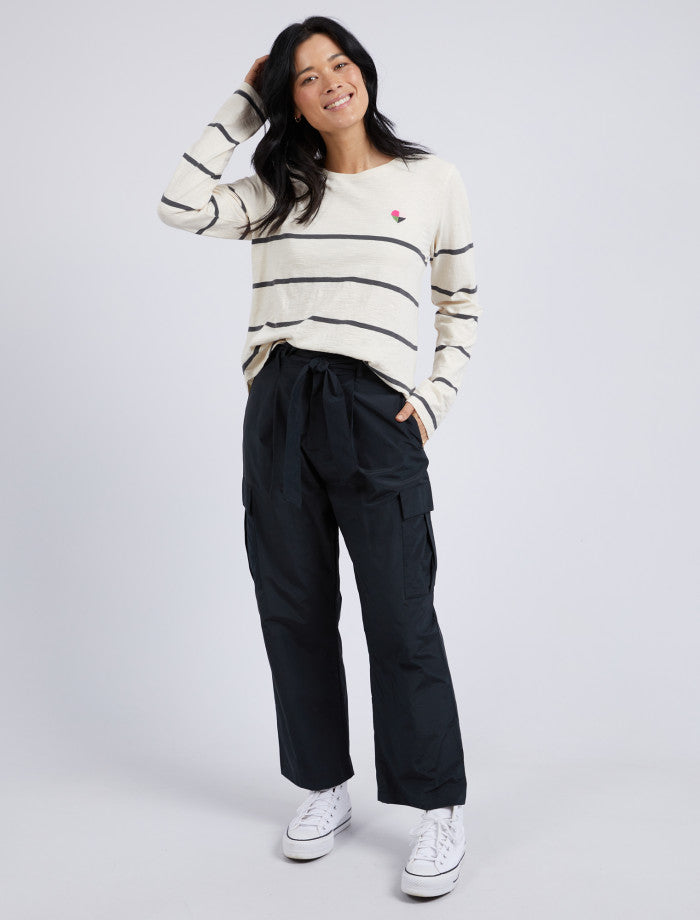 The Elm Heart Song Long Sleeve Tee is a chic and versatile piece that blends comfort with subtle design details. Crafted from soft cotton slub jersey, this tee features a yarn-dyed stripe pattern and delicate rose embroidery on the chest. The scooped hem and relaxed fit make it perfect for layering or wearing as a standalone statement.