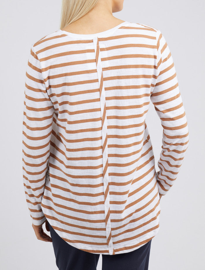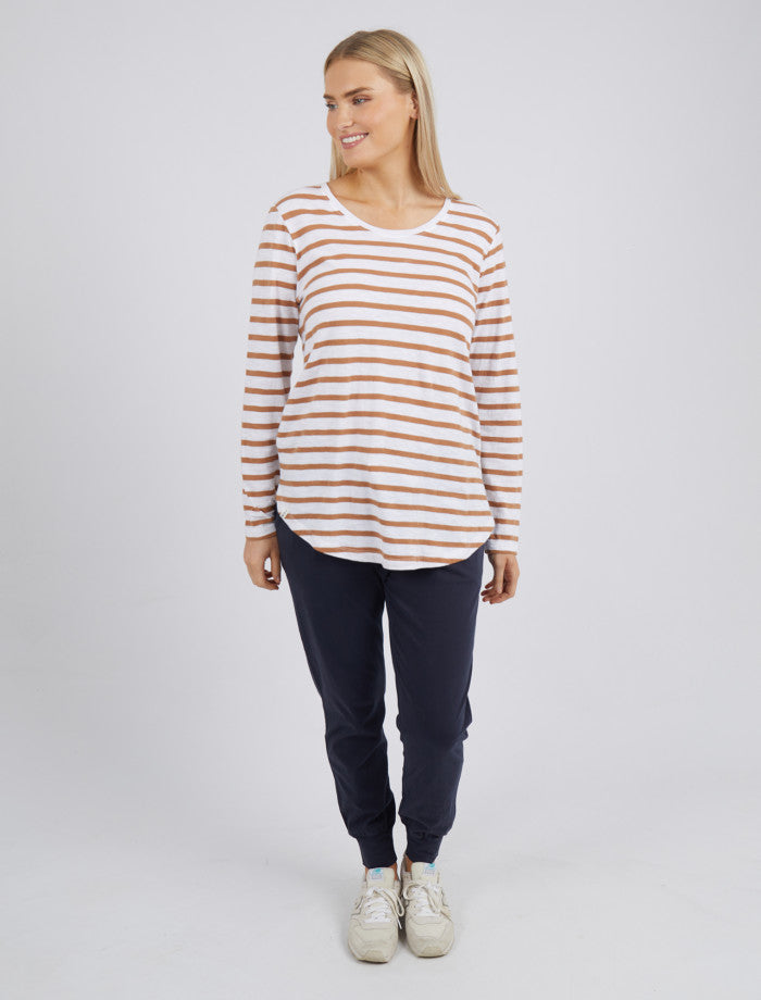 Introducing the Elm Scoop Long Sleeve Tee in Tan Stripe, a versatile and stylish addition to your wardrobe. Crafted from a soft and breathable cotton blend, this tee features a flattering scoop neckline and a relaxed fit, making it perfect for layering or wearing on its own.