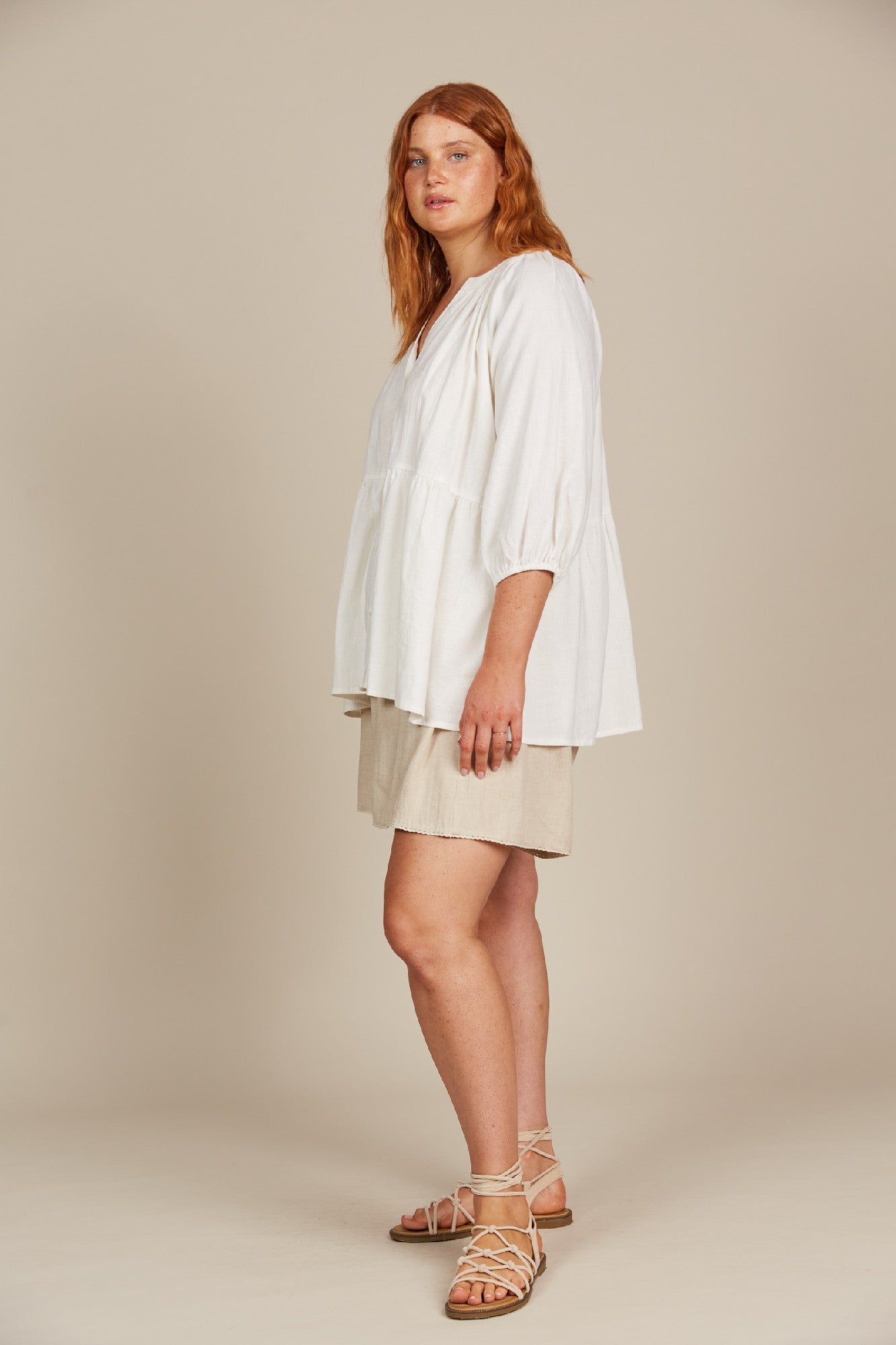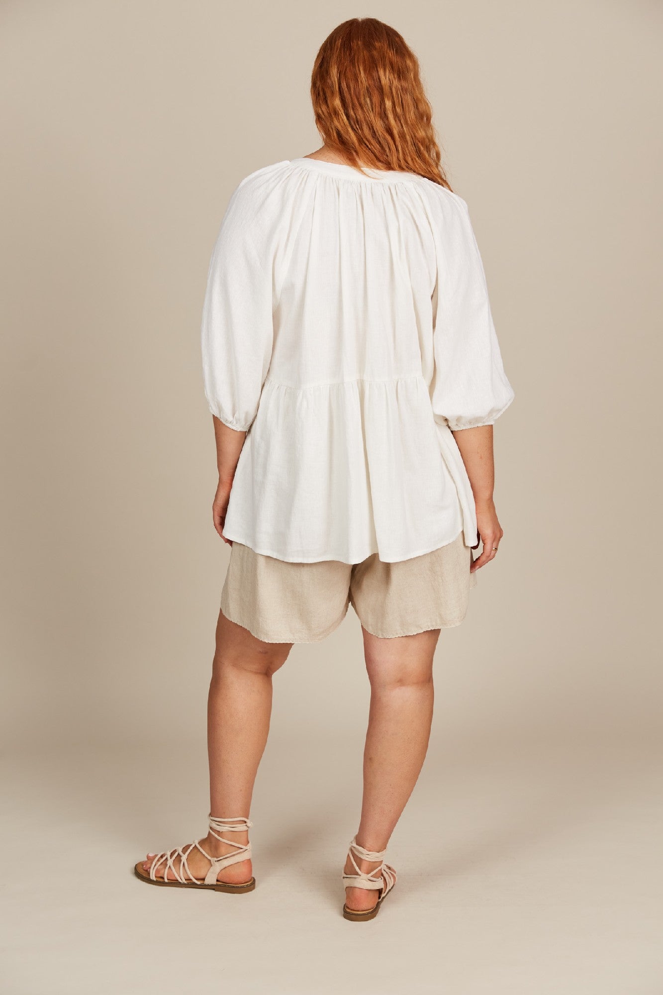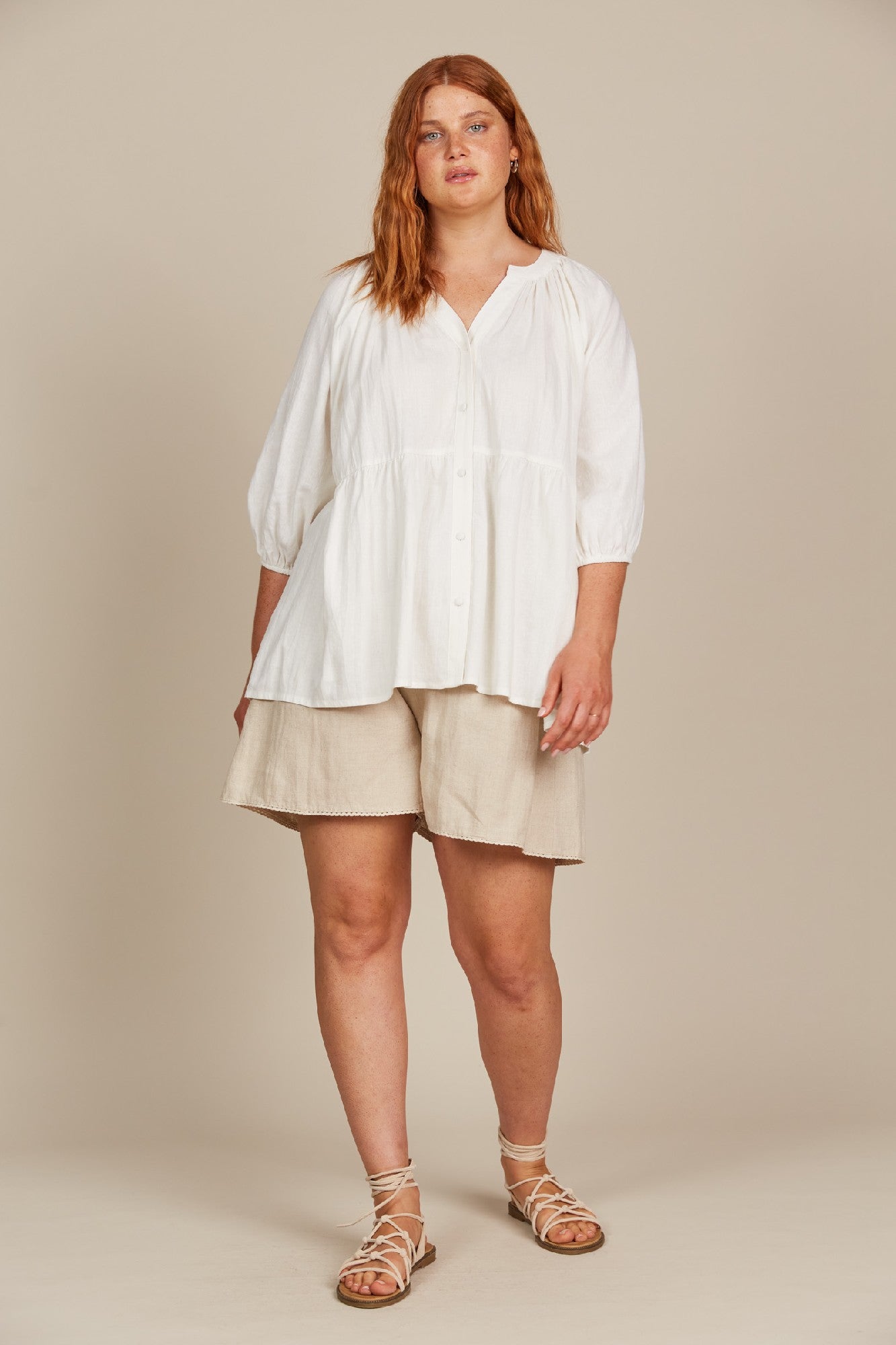 The Amelie Button Top offers a relaxed fit through the body. Choose your usual size for a comfortable silhouette.
