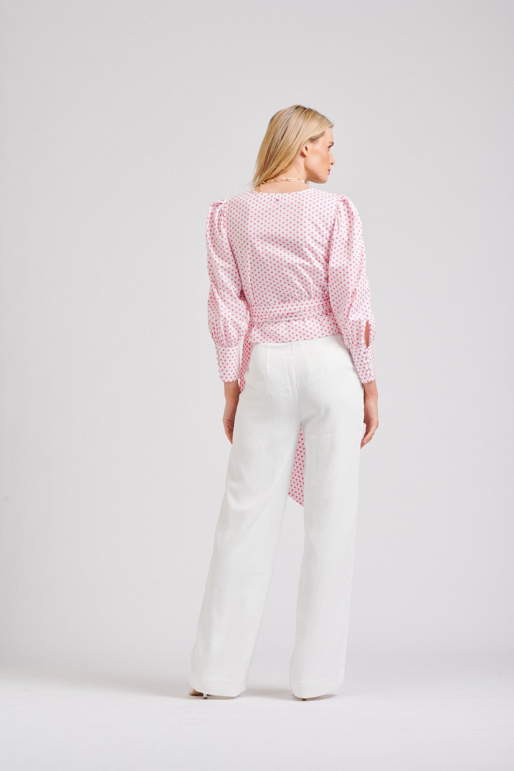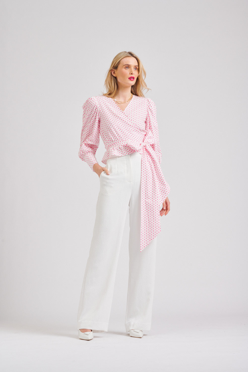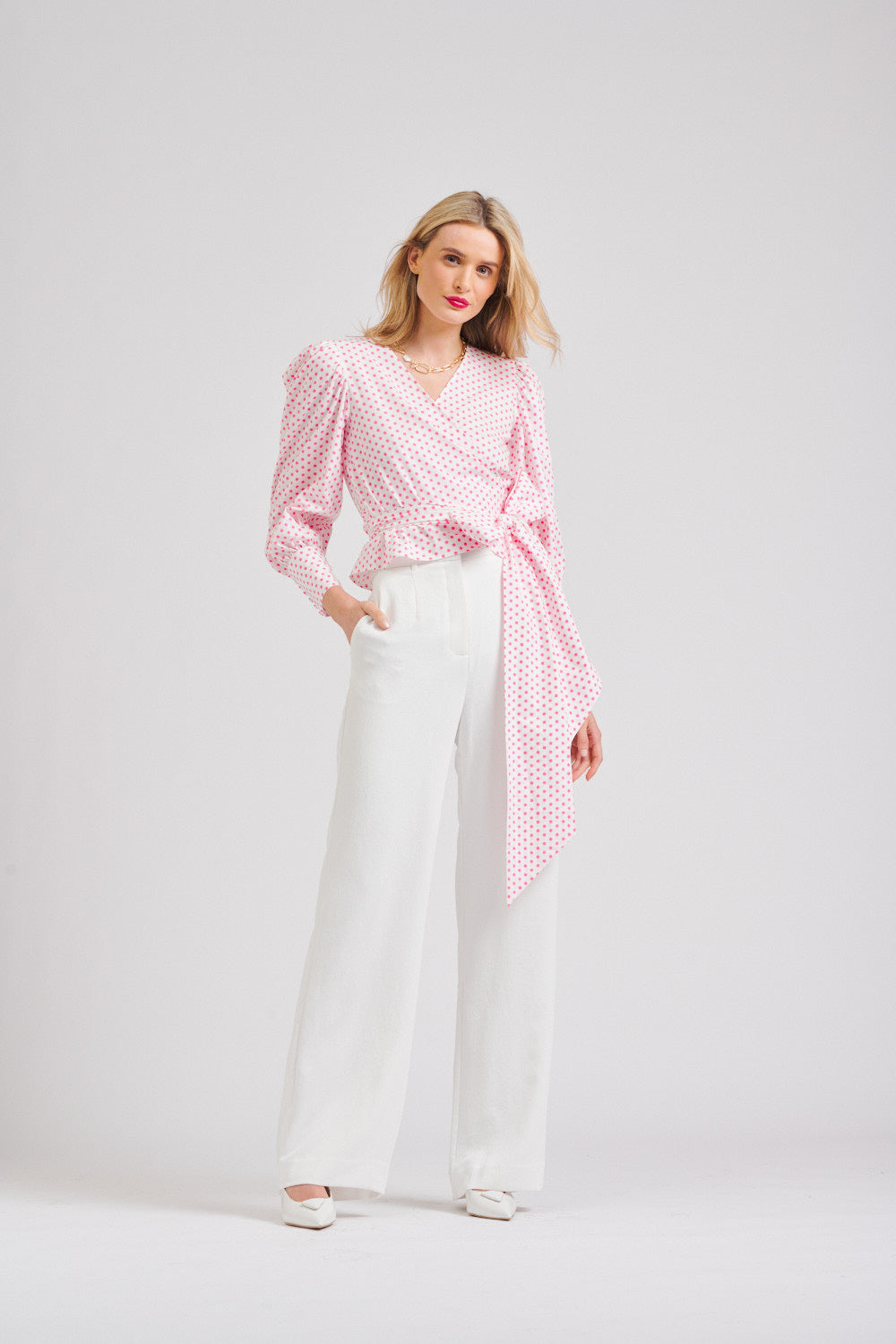 Elegant, flattering, and beautifully detailed, the Shirty Shirt Hazel Wrap – White/Pink Spot is a statement piece that brings timeless polish to every occasion.