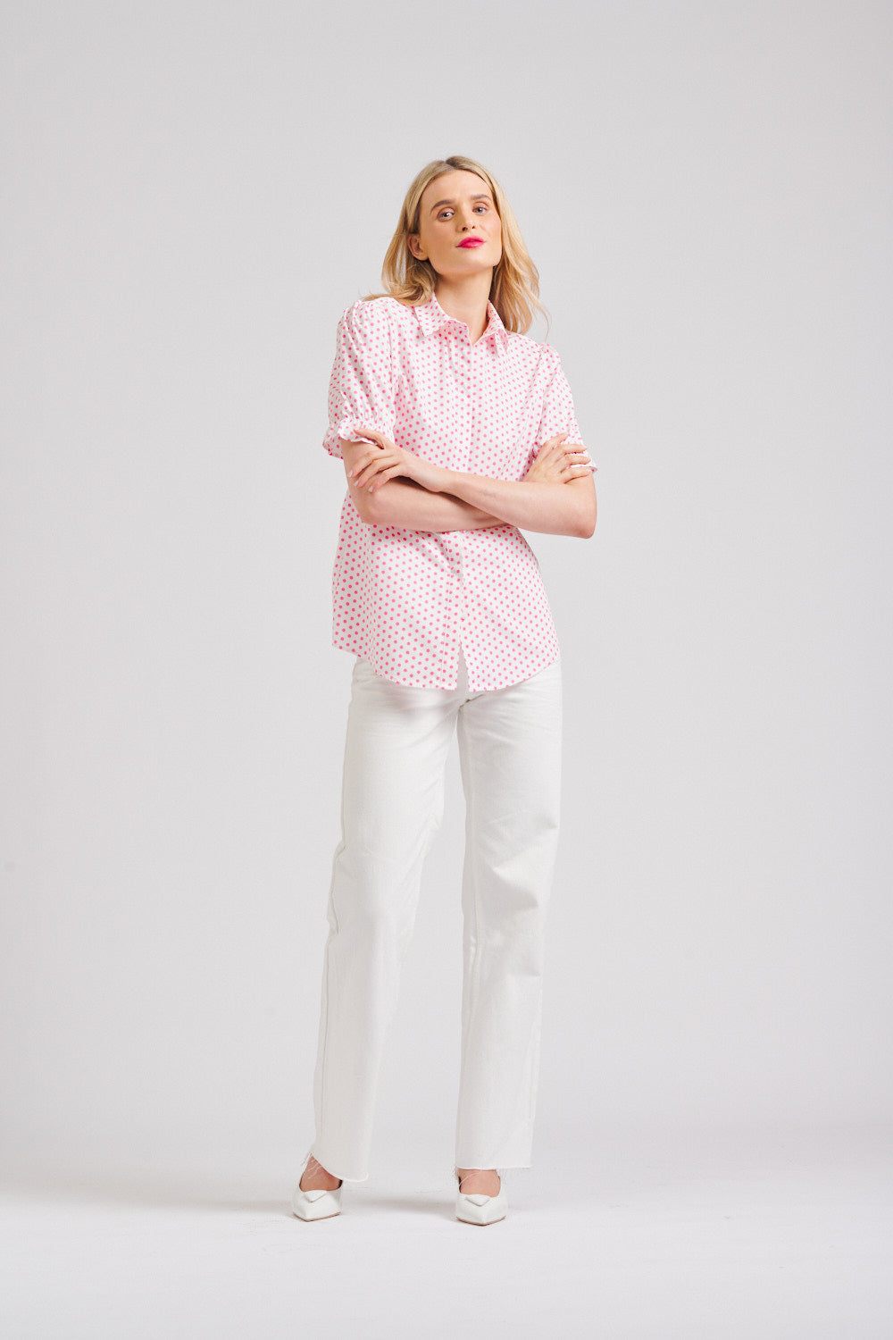 Polished, playful, and perfectly tailored, the Shirty Shirt Serena S/S – White/Pink Spot is a versatile summer staple you’ll reach for again and again.