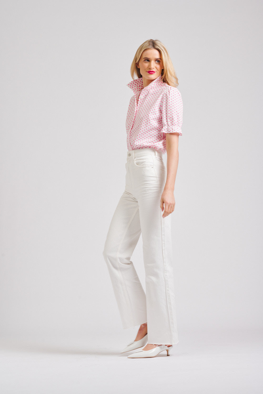 - Crisp white base with playful pink spot print