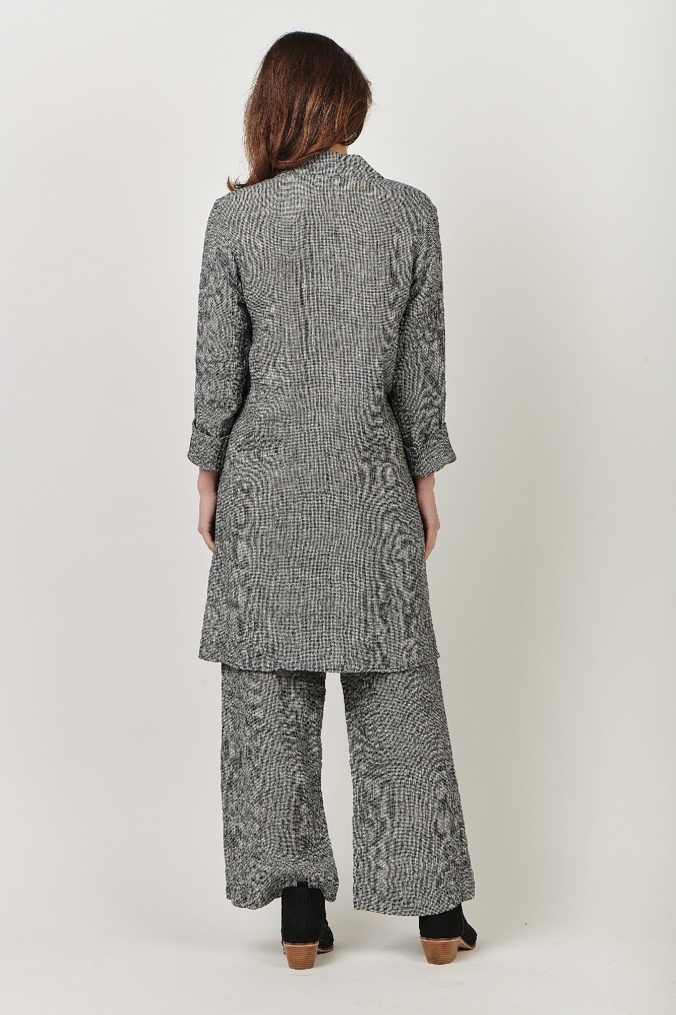 - Linen-blend fabrication with subtle puppytooth check pattern