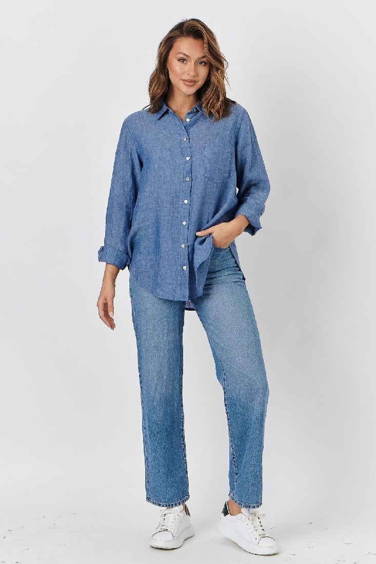 The Enveloppe Shirt – Denim Blue is a timeless staple with a soft feel and relaxed elegance — ready to wear your way, season after season.