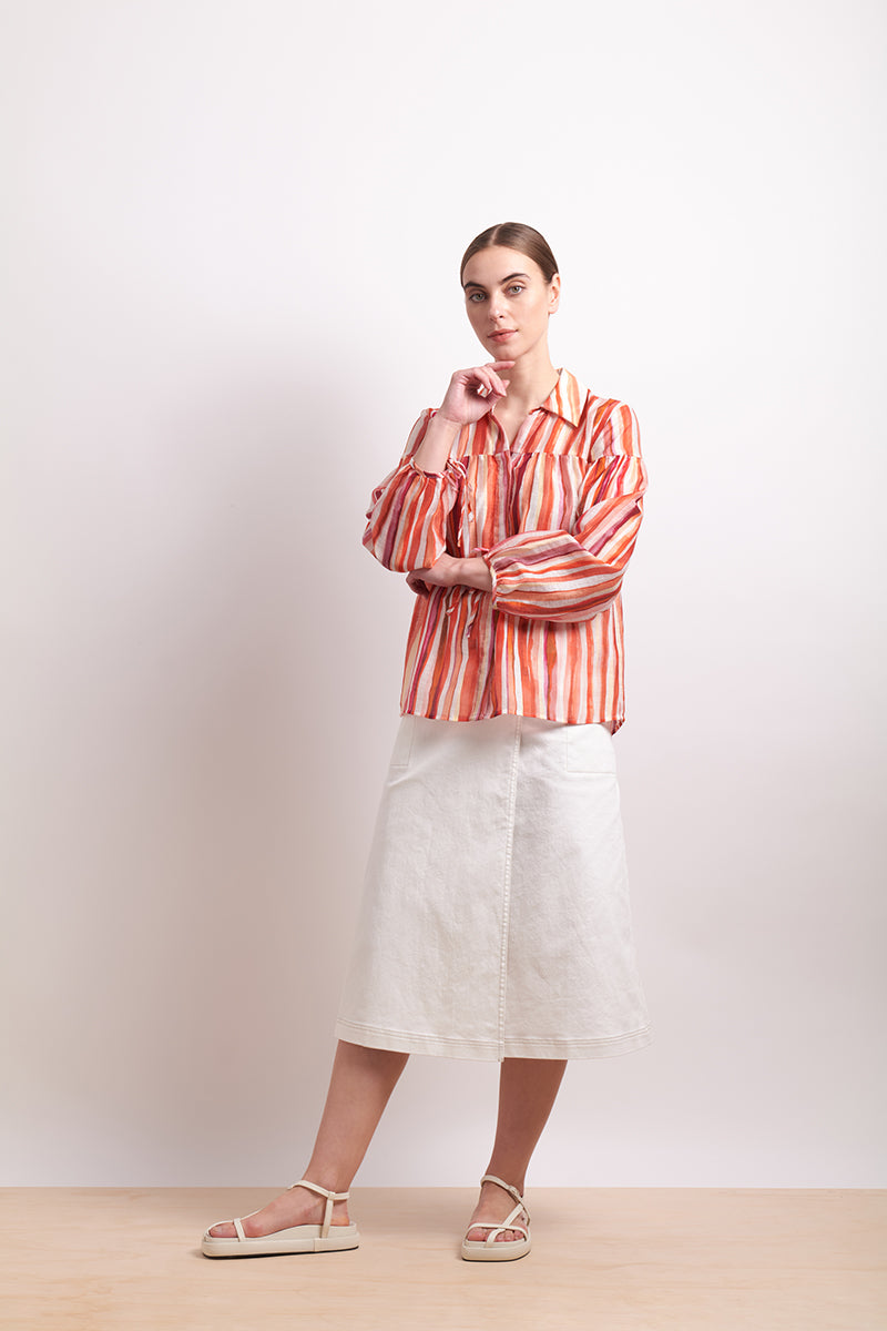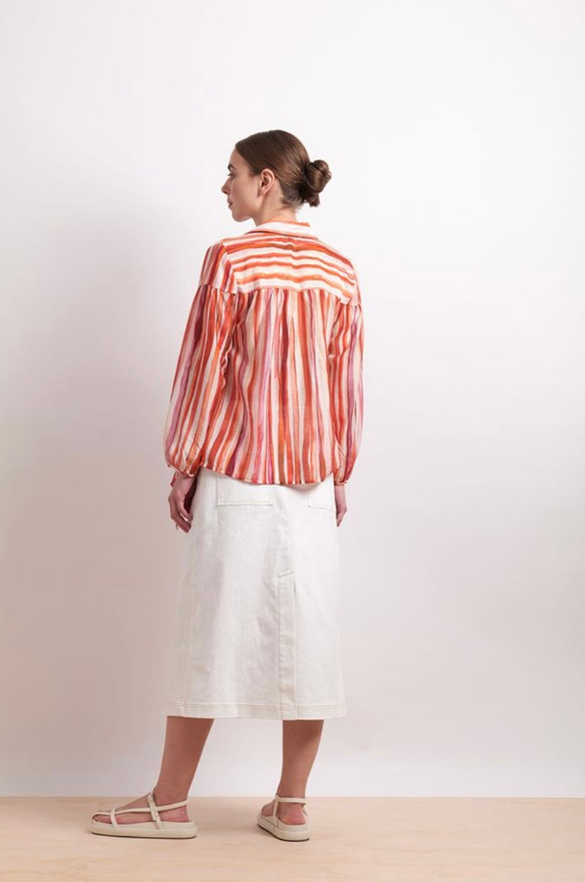 Make a colour statement in the Neris Shirt Draw The Line – Koi Stripe, a relaxed button-down that reinvents the classic shirt with painterly charm and refined tailoring. Designed in Christchurch, New Zealand, this shirt blends wearable structure with expressive energy in bold tones of crimson, papaya and cream.